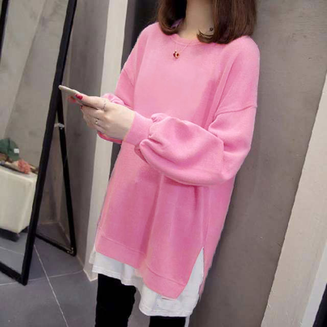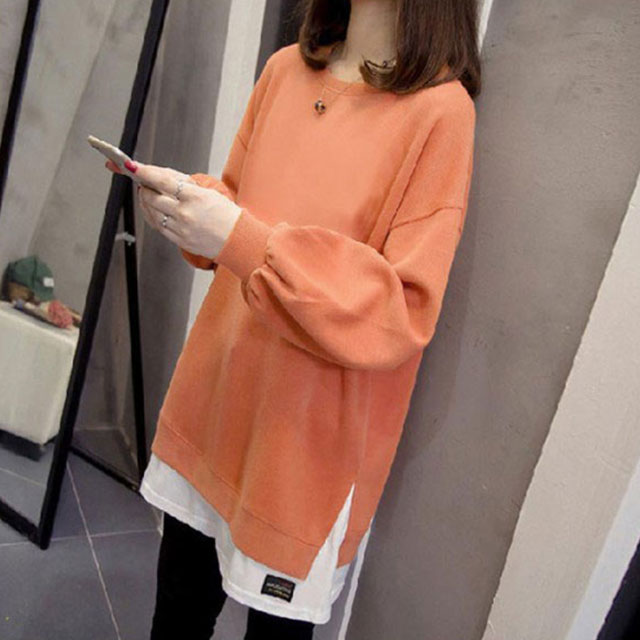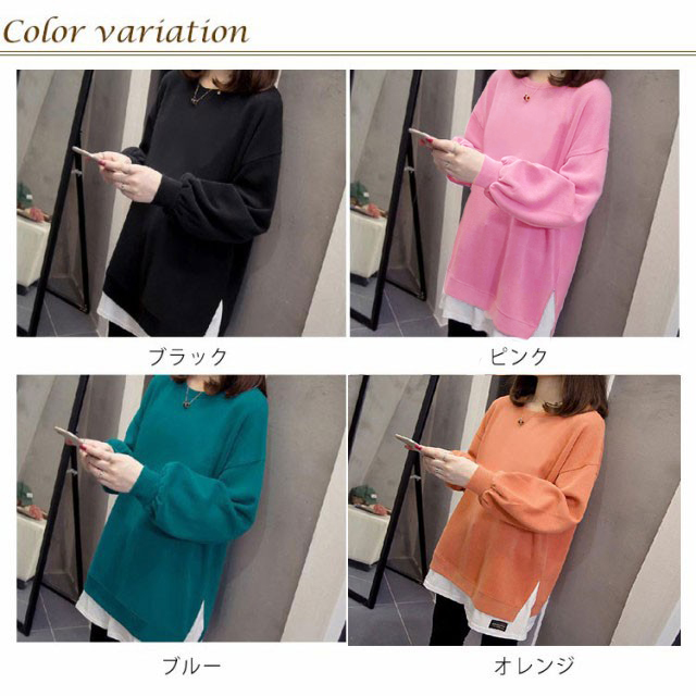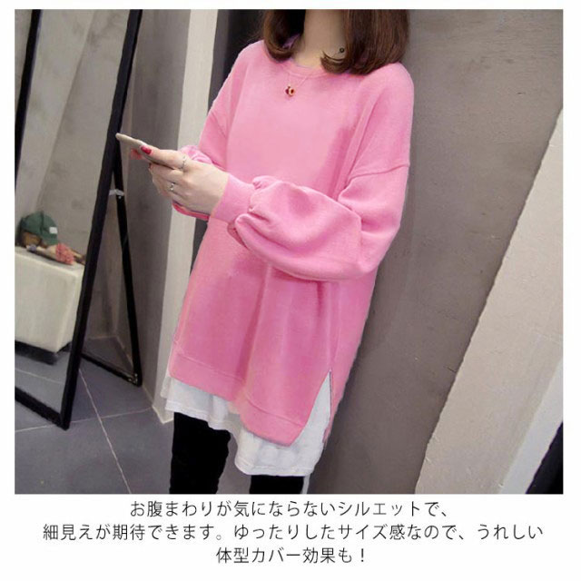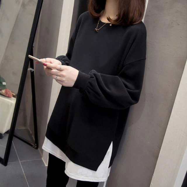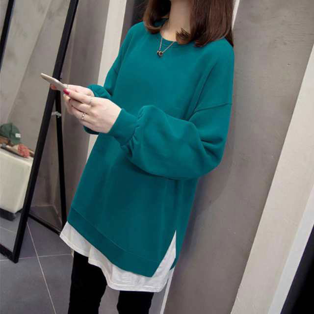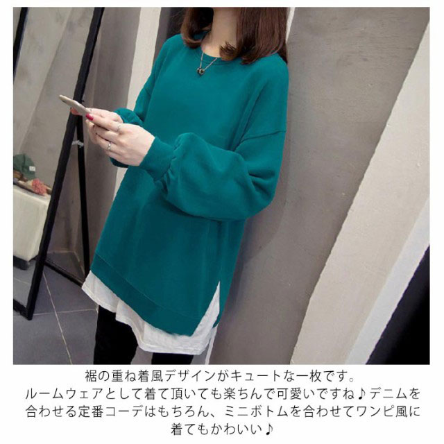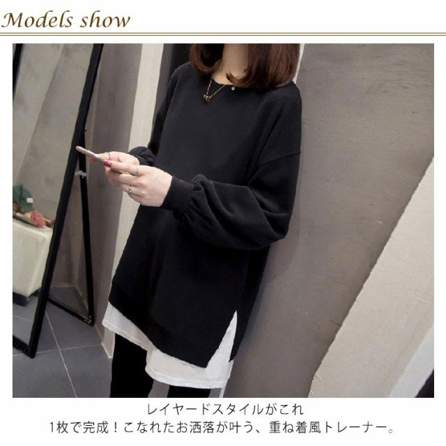 重ね着風 トレーナー レディース 長袖 トップス スウェット パーカー チュニック クルーネック カットソー tシャツ ミドル丈 レイヤード風 切り替え プルオーバー 春 秋 冬 スリット ゆったり 大きいサイズ 体型カバー 無地 綿 コットン 20代 30代 40代 M-4XL