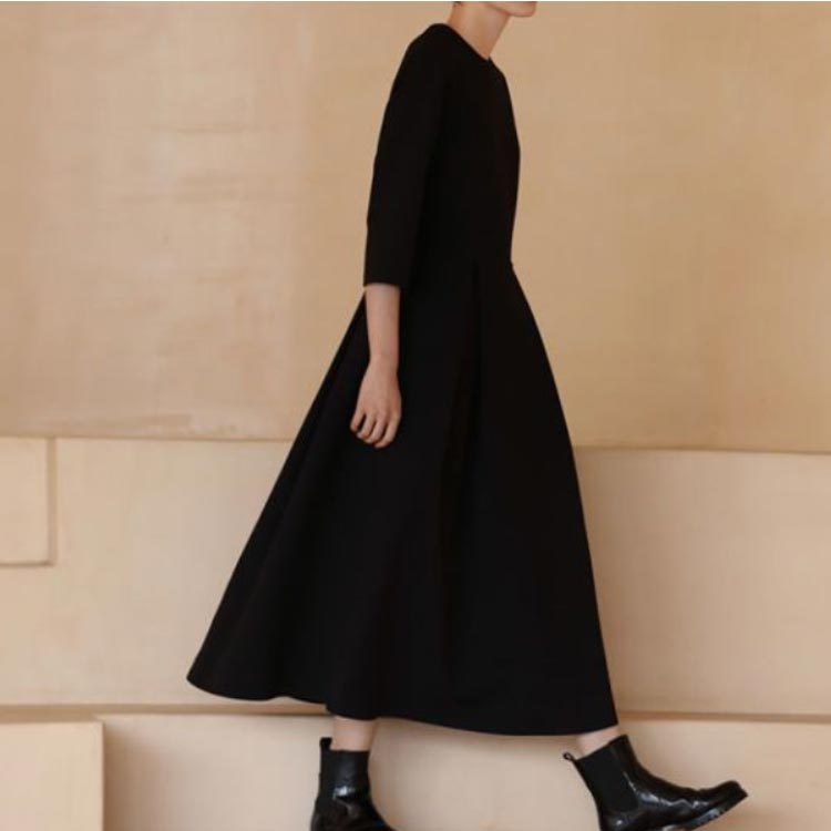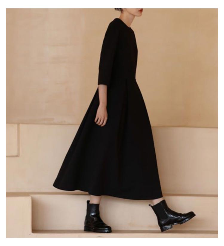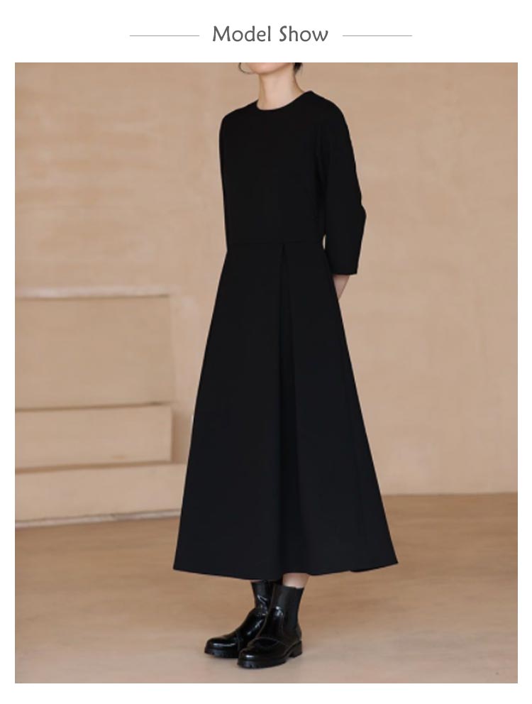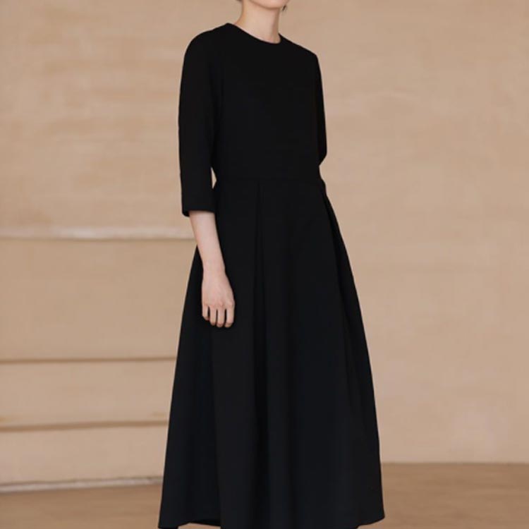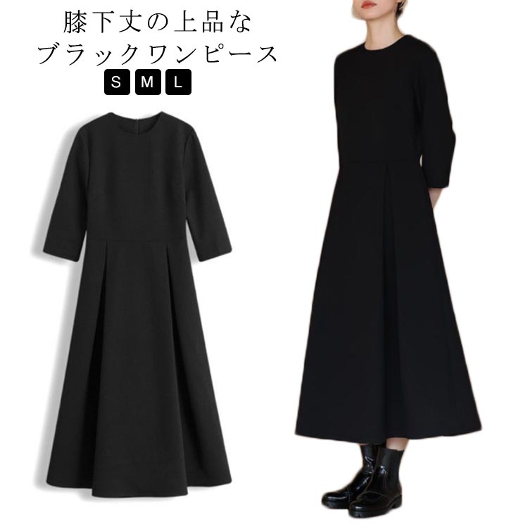 | 膝下丈の上品なブラックワンピース クールネックがデコルテ部分を綺麗に見せてくれます。 ウエストのタックフレアのデザインが、上品なフレアシルエットに仕上げ、大人フェミニンな印象に。 1枚でコーディネートが完成。 普段使いはもちろん結婚式や卒入園式などのフォーマルシーンにもオススメの1枚。 | |