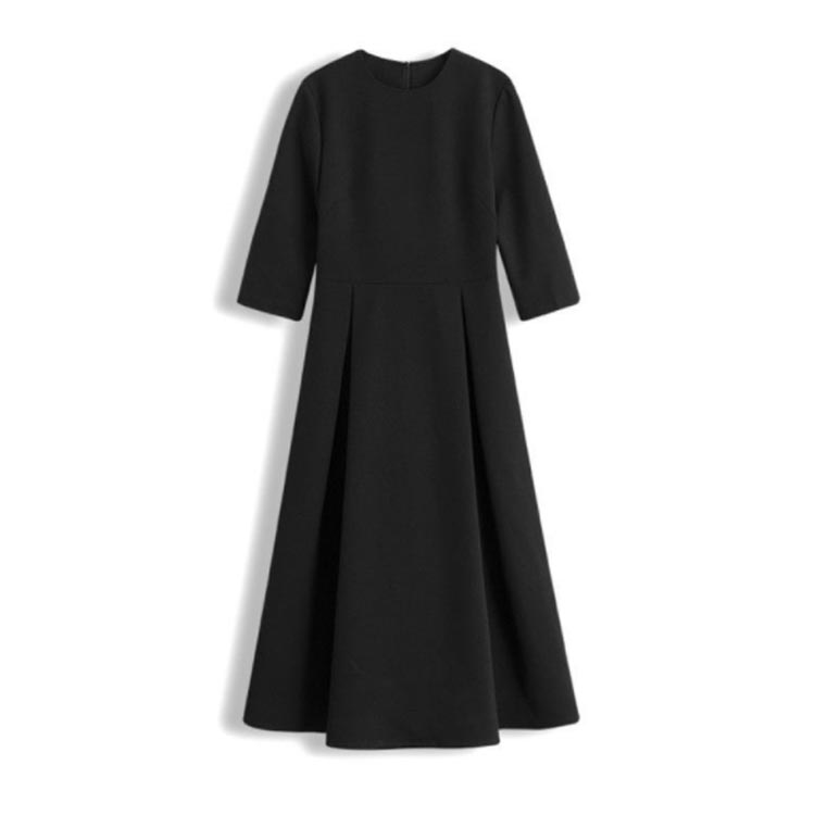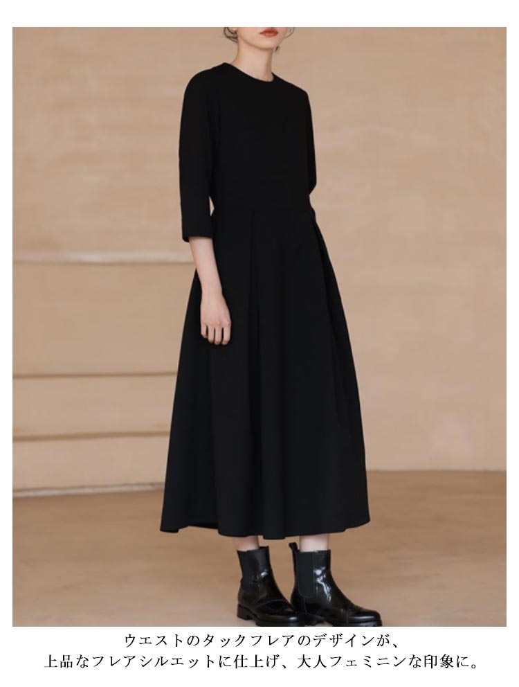 膝下丈の上品なブラックワンピースクールネックがデコルテ部分を綺麗に見せてくれます。ウエストのタックフレアのデザインが、上品なフレアシルエットに仕上げ、大人フェミニンな印象に。1枚でコーディネートが完成。普段使いはもちろん結婚式や卒入園式などのフォーマルシーンにもオススメの1枚。