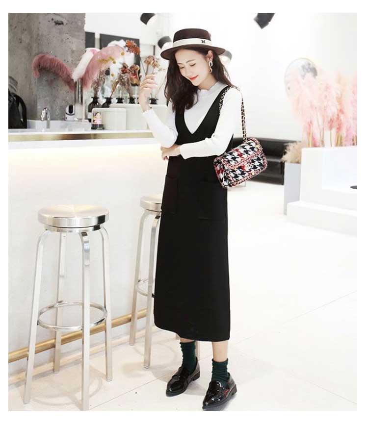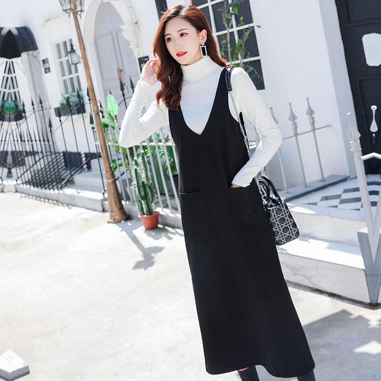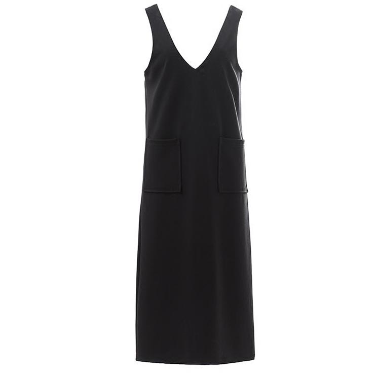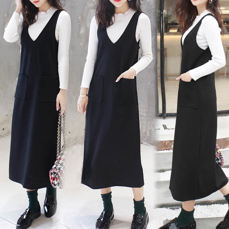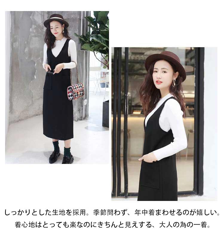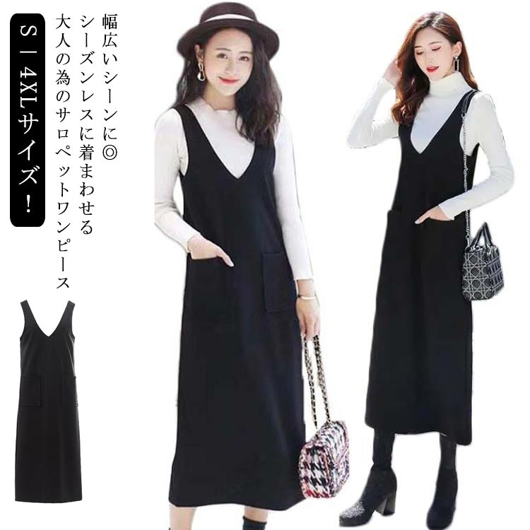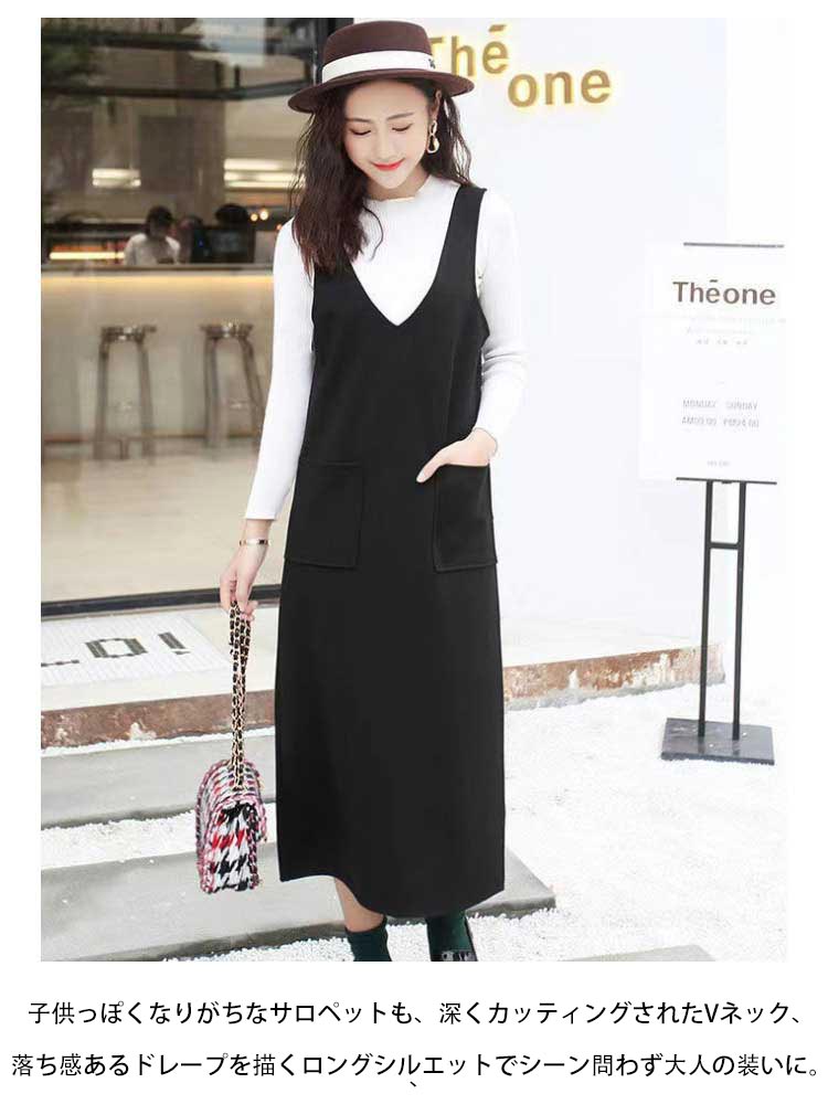 送料無料 深Vネック ジャンパースカート Hライン サロペット ワンピース ジャンスカ レディース オールインワン Vネック 膝下 ミモレ丈 30代 40代 ポケット付き 黒 大きサイズ ゆったり 体型カバー 通勤 通学