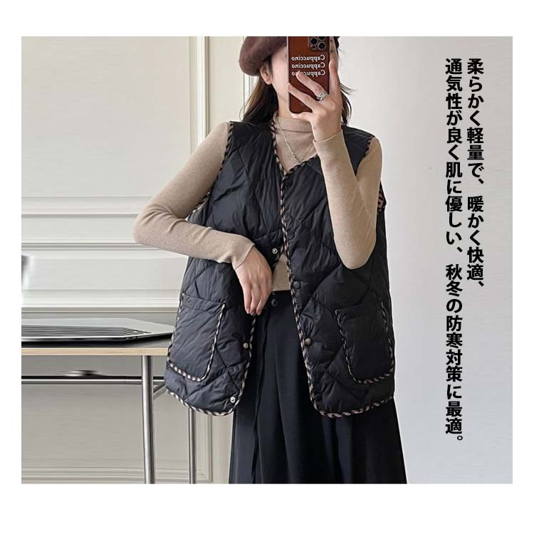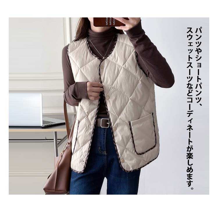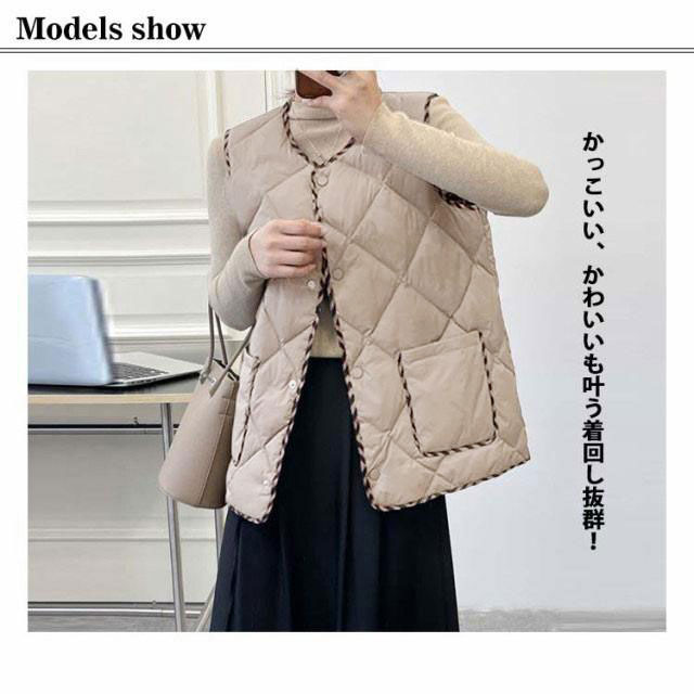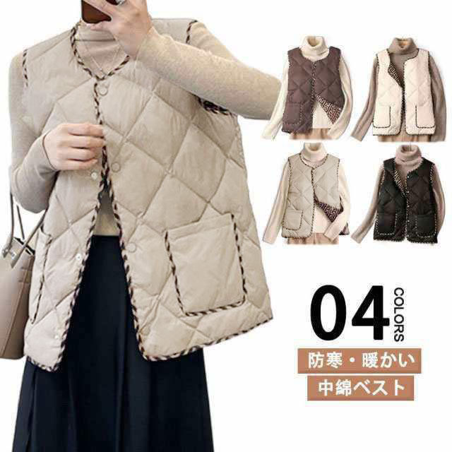 レディース 中綿ベスト ライトアウター 前開き 秋冬 春 キルティング トップス 中綿 厚手 防寒 軽量 暖かい 通勤 通学 ノースリーブ ジャケット ポケット付き 韓国風 カジュアル 防寒