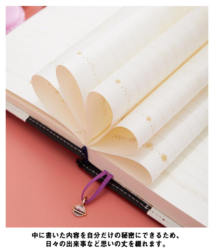 | 乙女心を引く可愛い鍵付き日記帳。 書き心地がよく、にじみや裏写りの少ない用紙を採用しているロック付き手帳。 中に書いた内容を自分だけの秘密にできるため、日々の出来事など思いの丈を綴れます。 カバーにはカード入れ付き、お気にいるの写真などを飾ったりするのも◎ 使い勝手抜群のペンホルダー付きで、日記を書きたい時すぐペンを取り出せるのも嬉しいポイントのB6ノート。 カバーは取り出し可能なので、ノートを入れ替えできるからコスパ抜群! 娘さんやお孫さんへの誕生日プレゼントや入学祝いなどに◎ | |