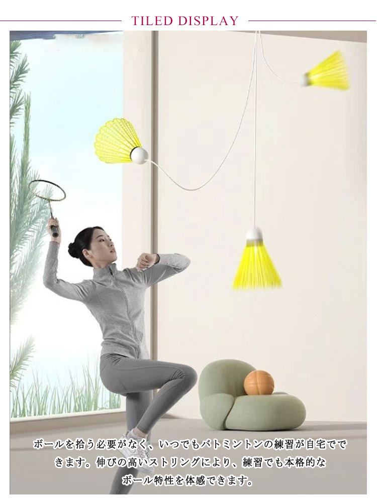 | 【初心者に最適】 【室内バドミントントレーナー】【取り付け簡単粘着タイプ】 ボールを拾う必要がなく、いつでもバトミントンの練習が自宅でできます。伸びの高いストリングにより、練習でも本格的なボール特性を体感できます。 ニーズに合わせて1m~2mの間で調整できます。 粘着ステッカー付きで、様々な場所に取り付け可能です。 | |