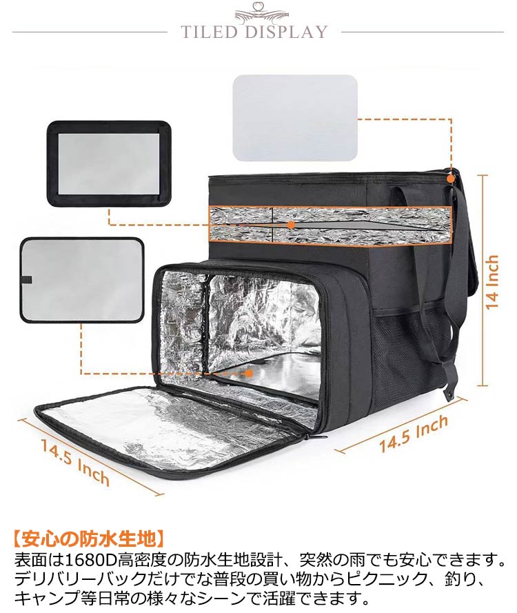 【防水】【50L】【保温保冷】【拡張可】用途:保温・保冷 、配達に最適なデリバリーバッグ【安心の防水生地】表面は1680D高密度の防水生地設計、突然の雨でも安心できます。デリバリーバックだけでな普段の買い物からピクニック、釣り、キャンプ等日常の様々なシーンで活躍できます。【丈夫の材料/保温・保冷効果高い】オックスフォード布+真珠綿+アルミ膜、厚い材料で構成されており、丈夫で耐久性が高いです。保温・保冷効果がより高いです。【2枚の仕切り板/ピザも入れる大容量】2枚の仕切り板付き、冷たい飲み物と温かい食べ物を隔てることができ、合理的に空間を区分できます。下の方は容量を拡充できる袋を設計して、50Lの大容量に達します。