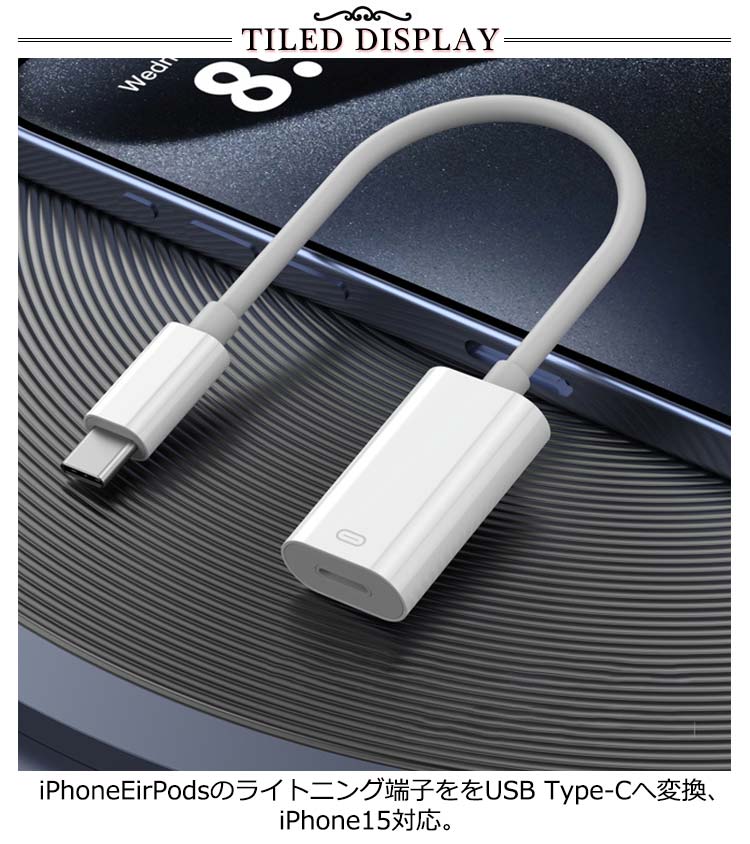 | ?お手持ちのライトニングケーブルをType-C端子へ変換するアダプターです。 ?iPhoneEirPodsのライトニング端子ををUSB Type-Cへ変換、iPhone15対応 ?充電、データー通信、通話対応 ?Appleらしい、シンプルながらスタイリッシュデザインが魅力です。 | |