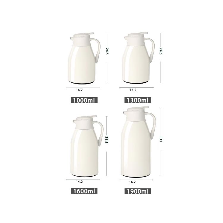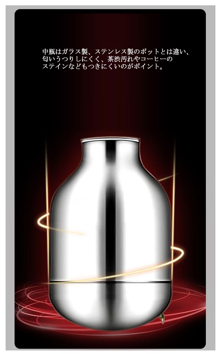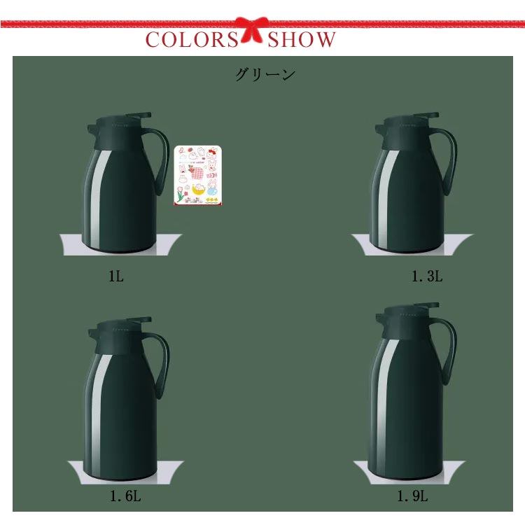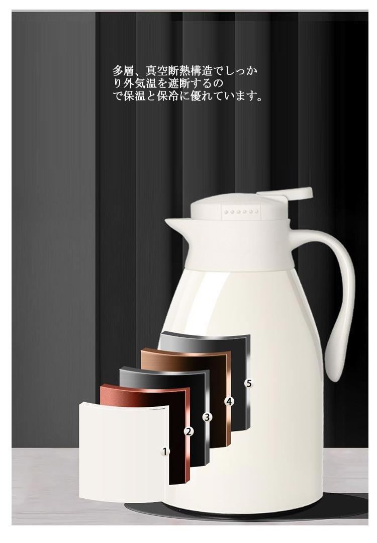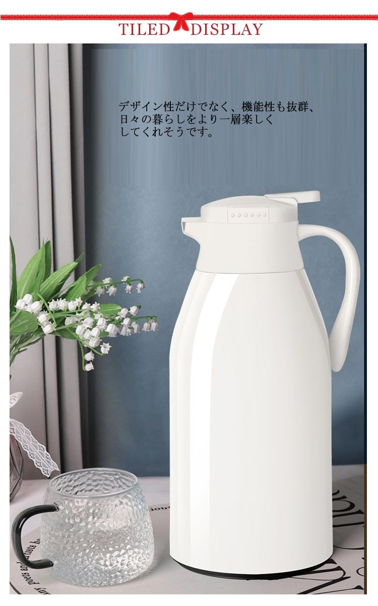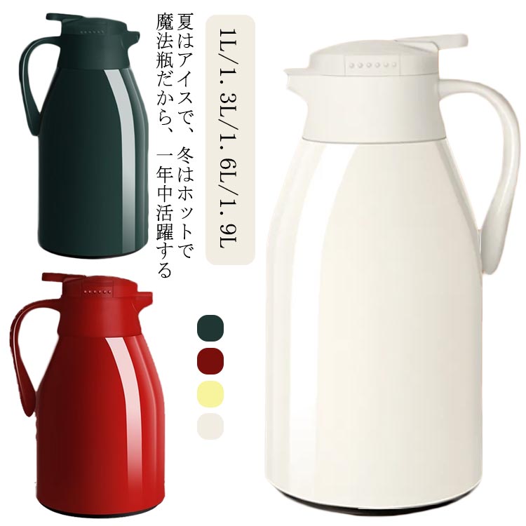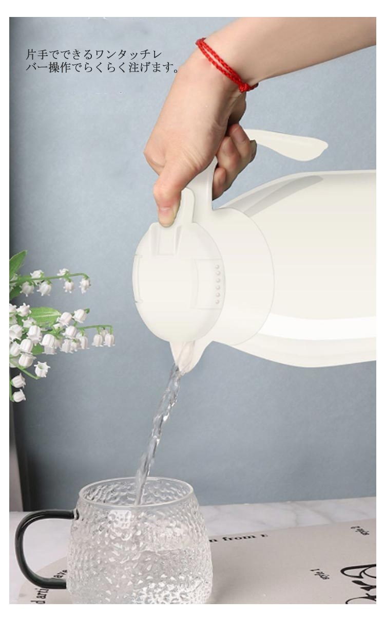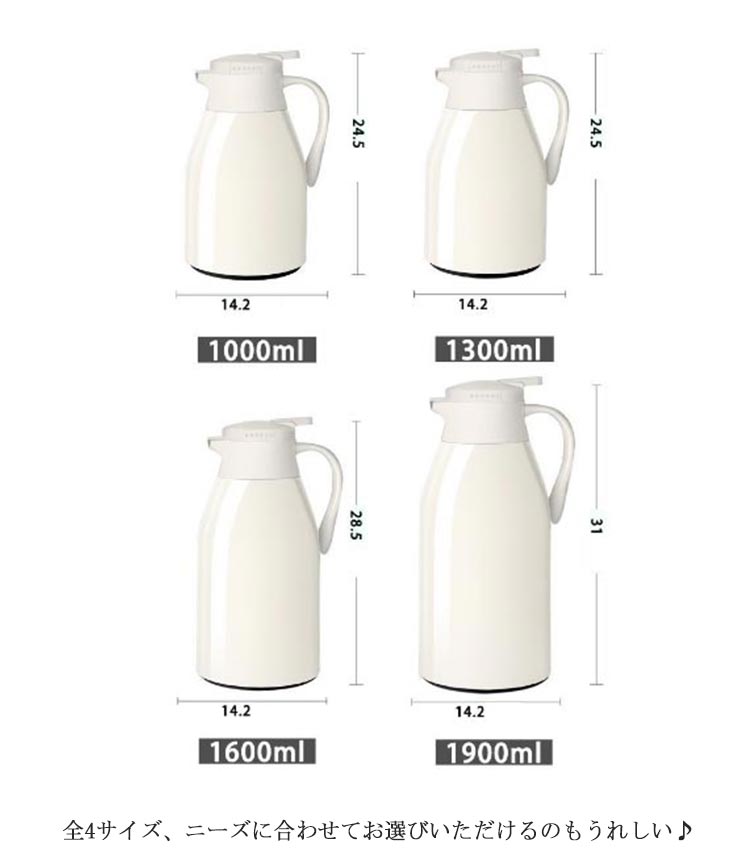 | 夏はアイスで、冬はホットで魔法瓶だから、一年中活躍する 多層、真空断熱構造でしっかり外気温を遮断するので保温と保冷に優れています。 中瓶はガラス製、ステンレス製のポットとは違い、匂いうつりしにくく、茶渋汚れやコーヒーのステインなどもつきにくいのがポイント。 片手でできるワンタッチレバー操作でらくらく注げます。 全4サイズ、ニーズに合わせてお選びいただけるのもうれしい? デザイン性だけでなく、機能性も抜群、日々の暮らしをより一層楽しくしてくれそうです。 | |