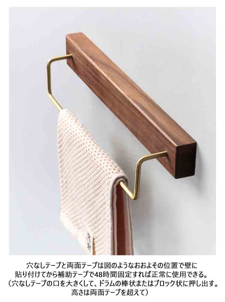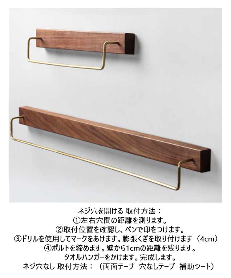 タオル掛けハンガー。タオルホルダーとしてはもちろん、トイレのインテリアも楽しめます。スチール×木目のシンプルデザイン ヴィンテージ風の質感を表現しました。耐衝撃性や高い剛性を持ち、錆びることがなく、色落ちの心配も要らなく、長期に使用できます。美しい木目とファション感溢れる真鍮棒の組み合わせ。ペーパーホルダーはトイレ、ベッドルーム、浴室、ホテルレストラン、バー、公衆トイレな どに適合します。ワンポイントで上質な空間に早変わりします。ネジ穴を開ける 取付方法:1.左右穴間の距離を測ります。2.取付位置を確認し、ペンで印をつけます。3.ドリルを使用してマークをあけます。膨張くぎを取り付けます(4cm)。4.ボルトを締めます。壁から1cmの距離を残ります。タオルハンガーをかけます。完成します。ネジ穴なし 取付方法:(両面テープ 穴なしテープ 補助シート)穴なしテープと両面テープは図のようなおおよその位置で壁に貼り付けてから補助テープで48時間固定すれば正常に使用できる。(穴なしテープの口を大きくして、ドラムの棒状またはブロック状に押し出す。高さは両面テープを超えて)