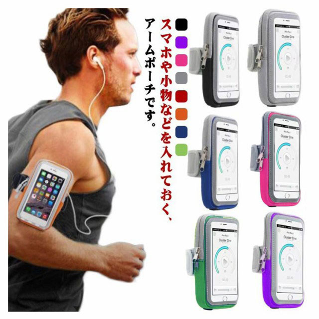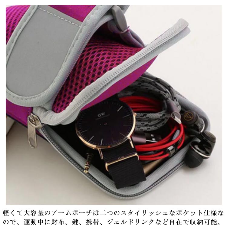 スマホや小物などを入れておく、アームポーチです。サイズ調整が可能で、メンズ、レディース対応の男女兼用モデル。腕を巻く部分は面ファスナーで調整可能!ソフトで伸縮素材のため、付け心地抜群。タッチパネル部分は高い透明度を誇るPVC素材で、ポーチに入れたままスマホを操作可能。軽くて大容量のアームポーチは二つのスタイリッシュなポケット仕様なので、運動中に財布、鍵、携帯、ジェルドリンクなど自在で収納可能。音楽を聴くためのイヤホン専用穴が設けられていますので、余分なコードは収納しておけます。