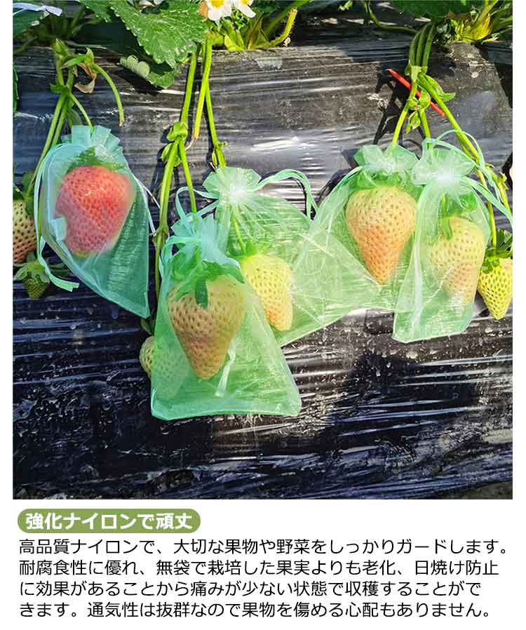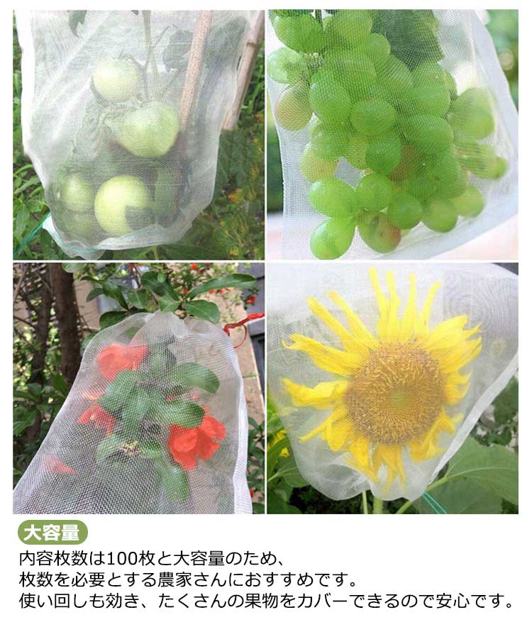【植物保護をするツール】虫や鳥から丹精込めて育てた果物を守る防虫、防鳥ネットです。栽培するものによって必要になるサイズが異なることから、大きさが違う2種類のネットをご用意いたしました。【大容量】内容枚数は100枚と大容量のため、枚数を必要とする農家さんにおすすめです。使い回しも効き、たくさんの果物をカバーできるので安心です。【巾着袋設計】巾着袋のように予め袋口に口を縛る紐が付いているため、袋にかぶせたいものを入れ、口を閉めるだけです。開閉にも非常に便利です。袋に入れたまま果実を保存できる。ブドウ、リンゴ、イチゴ、イチジク、植物、野菜、花を保護し、植物を健康に保ちます。【強化ナイロンで頑丈】高品質ナイロンで、大切な果物や野菜をしっかりガードします。耐腐食性に優れ、無袋で栽培した果実よりも老化、日焼け防止に効果があることから痛みが少ない状態で収穫することができます。通気性は抜群なので果物を傷める心配もありません。【用途】通気性が良いメッシュ素材を使用しているため、害虫、害鳥対策だけでなく、種びたし、催芽、花粉単離、種子保管、完熟栽培の促進など様々な用途でご使用いただけます。【通気性が良いメッシュ素材】害虫、害鳥対策だけでなく、種びたし、催芽、花粉単離、種子保管、完熟栽培の促進など様々な用途でご使用いただけます。