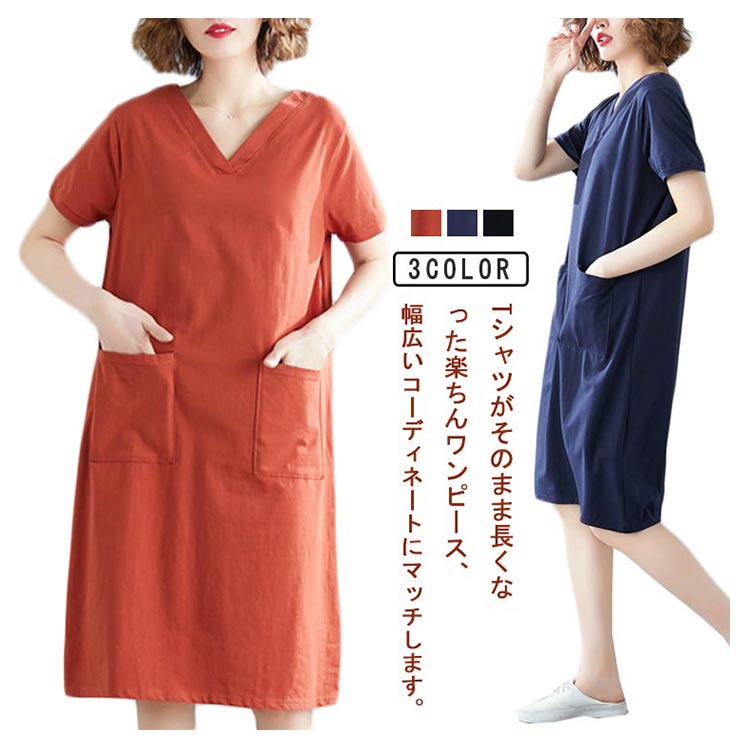 送料無料 Tシャツワンピース 春 夏 Tシャツ ワンピース Vネック レディース カットソー 半袖 ミモレワンピース 膝丈 ひざ丈 ロングTシャツ チュニックワンピース ゆったり カジュアル 大人 夏ワンピ ルームウェア