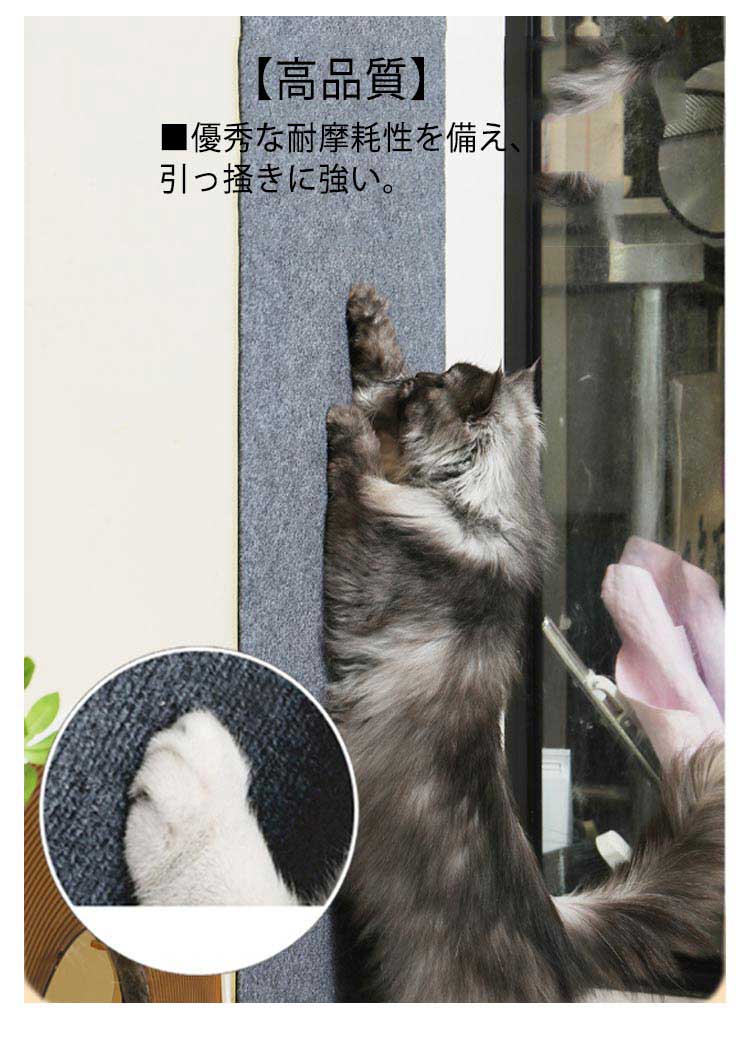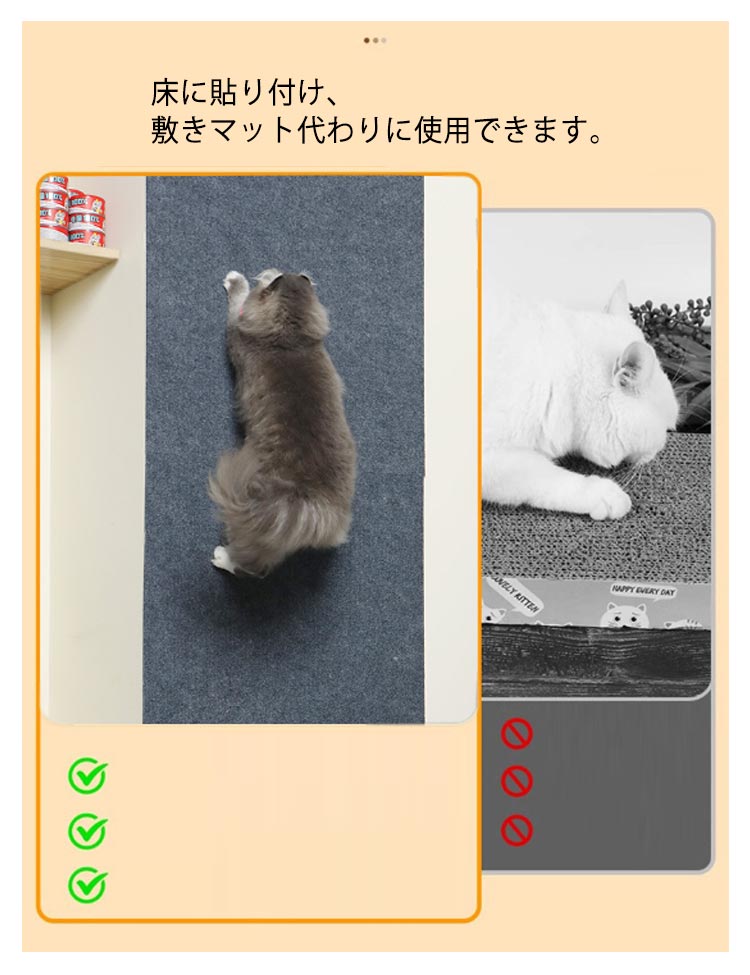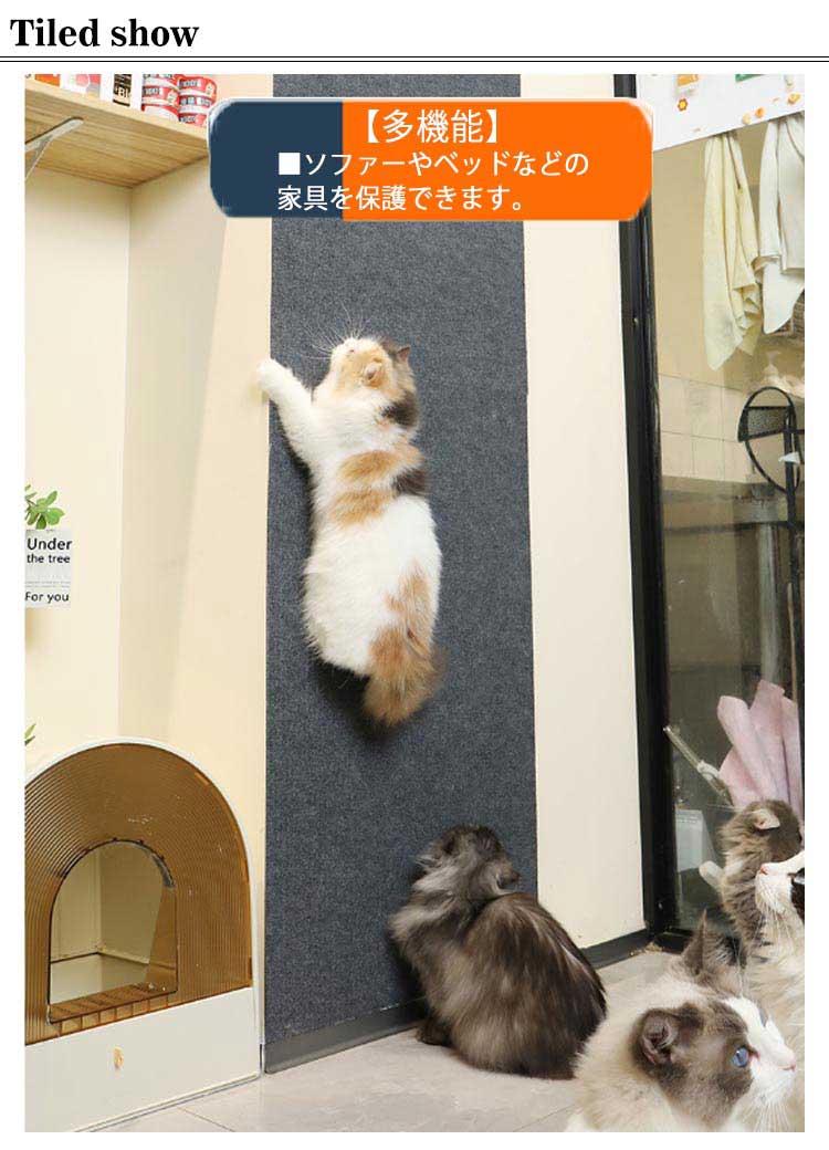 | 【多機能】 ■ソファーやベッドなどの家具を保護できます。 ■壁に貼り、高所に上らせることができます。 ■床に貼り付け、敷きマット代わりに使用できます。 【高品質】 ■優秀な耐摩耗性を備え、引っ掻きに強い。 ■裏には高粘着力のテープ付き、しっかりくっつきます。 【使用便利】 ■自由に切り取りできます。 ■裏にテープ付き、剥がして貼るだけで便利です。 ■水洗いOKで、お手入れも簡単です。 | |