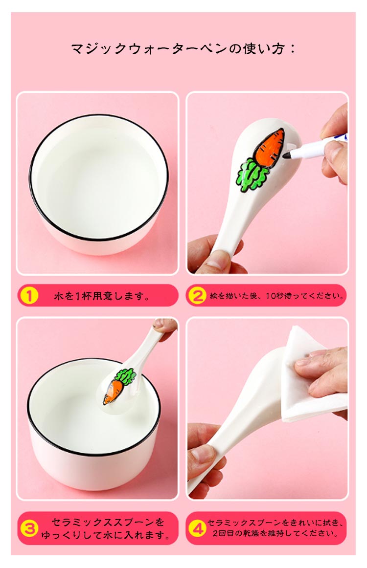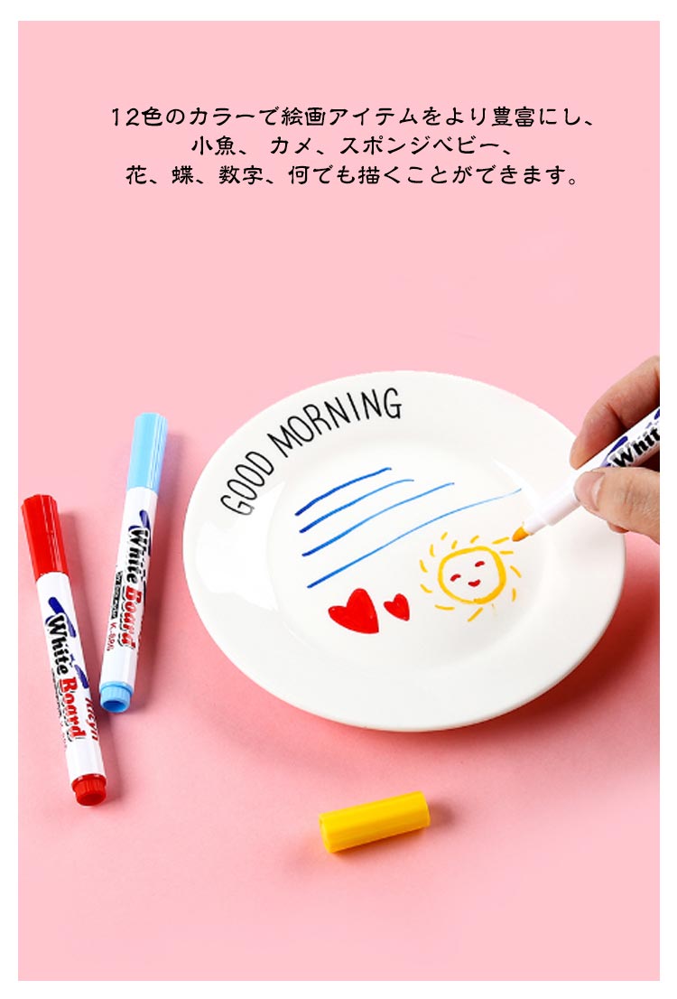 不思議な水絵ペン。スプーン付き!絵は水に浮かんでいる。絵は水に溶けないようにし、動物、花、木などを描くことができます。12色のカラーで絵画アイテムをより豊富にし、小魚、 カメ、スポンジベビー、花、蝶、数字、何でも描くことができます。信頼できる安全性!非毒、無酸、環境と体にやさしいです。手や服にインクを付いた場合、水で簡単に洗えます。マジックウォーターペンの使い方:1.水を1杯用意します。2.絵を描いた後、10秒待ってください。3.セラミックススプーンをゆっくりして水に入れます。4.セラミックスプーンをきれいに拭き、2回目の乾燥を維持してください。
