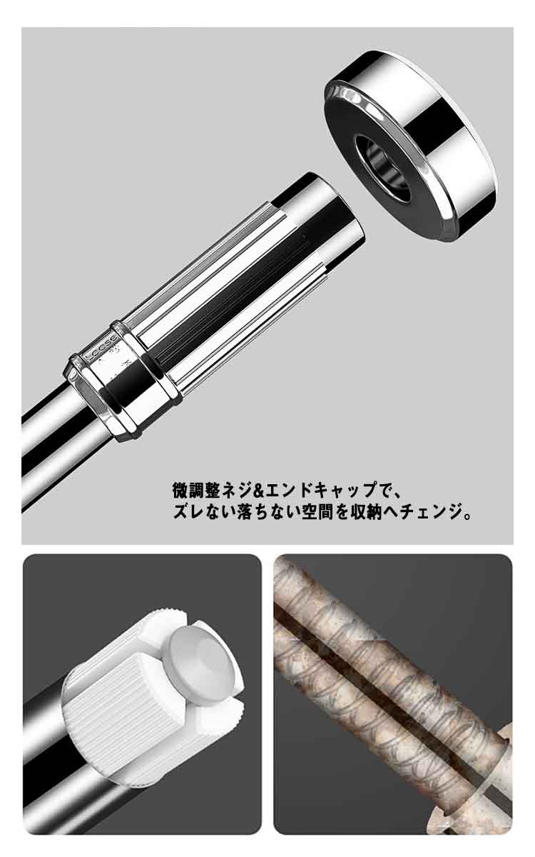 賃貸住宅は収納が少なくて不満、そんな時は工具不要の伸縮ポール届いたらラクラク設置。後付けとは思えない耐荷重。重たい冬物の収納も◎定番のカーテン・クローゼット・洗濯干し。他にも兄弟部屋の仕切り・2本移行に掛けて天板を乗せれば大もの収納/かごを乗せたら小物収納。あなたの使い方を見つけて教えてください!微調整ネジで完璧に圧着!長く支えて/ずり落ちない。微調整ネジ&エンドキャップで、ズレない落ちない空間を収納ヘチェンジ。【使用方法】1、取り付けたい箇所の横幅を伸縮して伸ばす2、固定されている棒と伸縮して伸ばした隣の両方を、左右逆に回して固定する3、調整ねじをクルクル回してガッチリ固定