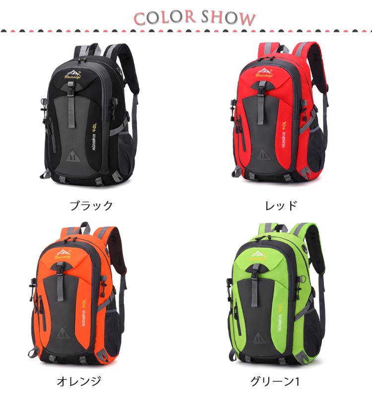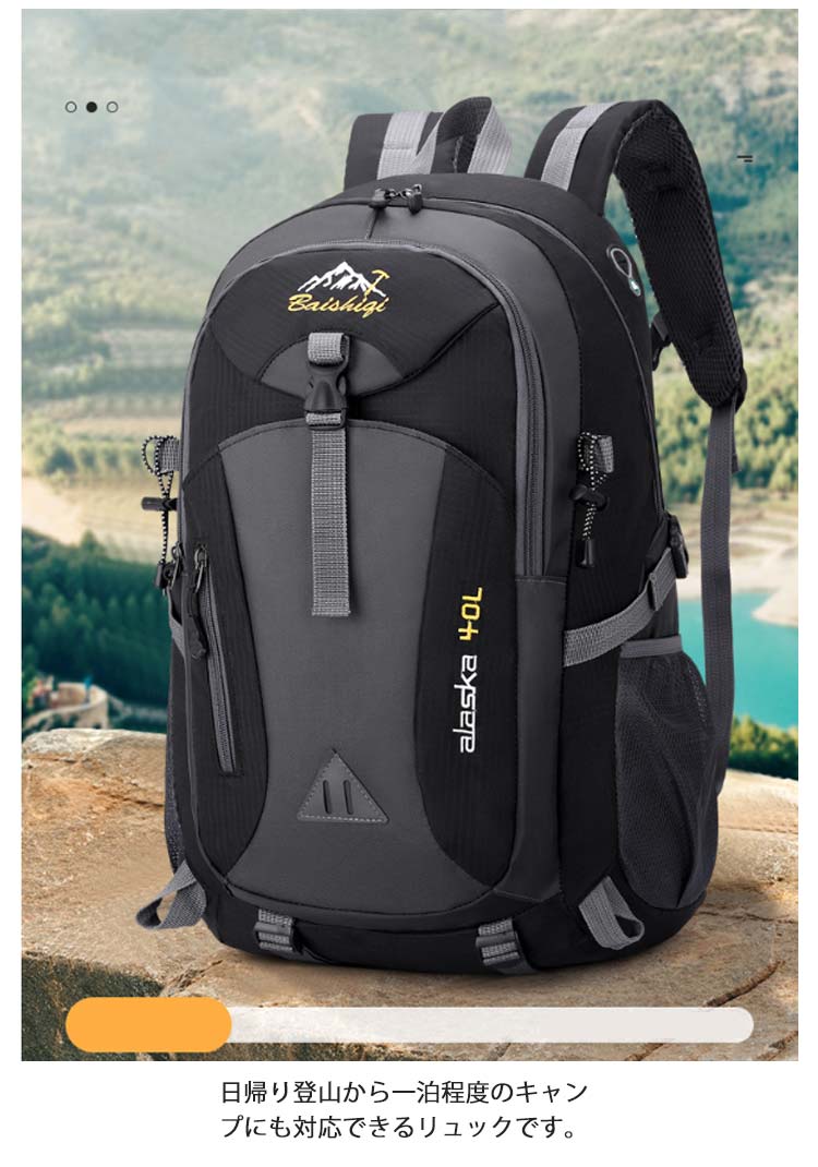 | 【登山リュック】【軽量?撥水加工】【40Lの大容量】 日帰り登山から一泊程度のキャンプにも対応できるリュックです。 シンプルなのに、収納力抜群!外側の小さなポケットは携帯電話、充電器、鍵、コイン?カギなどの小物を携帯するのに便利です。 中央のポケットと大きなメインポケットは、衣類、カメラ、iPadなどの荷物を入れるのに十分です。 表地は傷などが付きにくい高密度の生地を使用し、作りも丈夫なので、耐水、耐摩耗性、耐久性を実現できます。 イヤホン専用穴からイヤホンを接続することで、バックパックを開けずに音楽を聴くことができます。 登山、ハイキング、キャンプ、トレッキング、野外フェス、旅行、タウンユースでも大活躍。 | |
