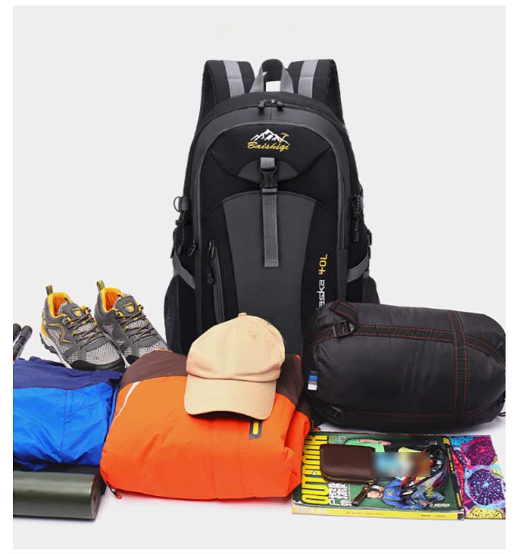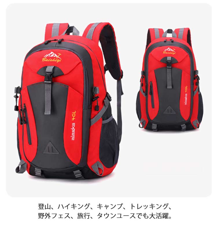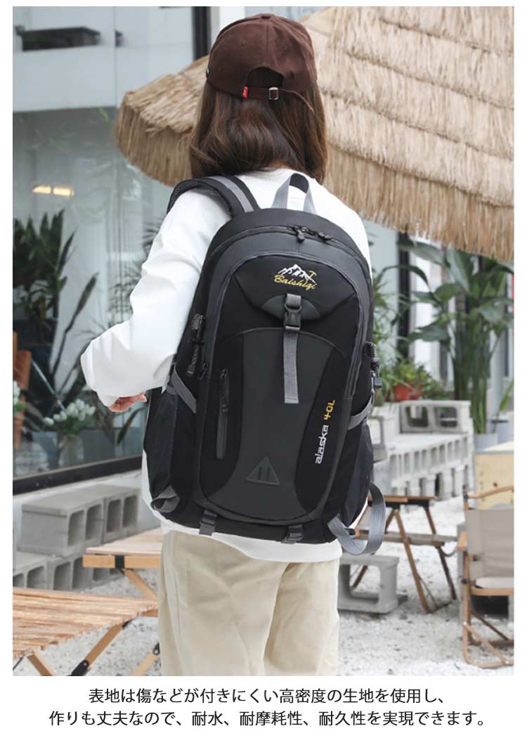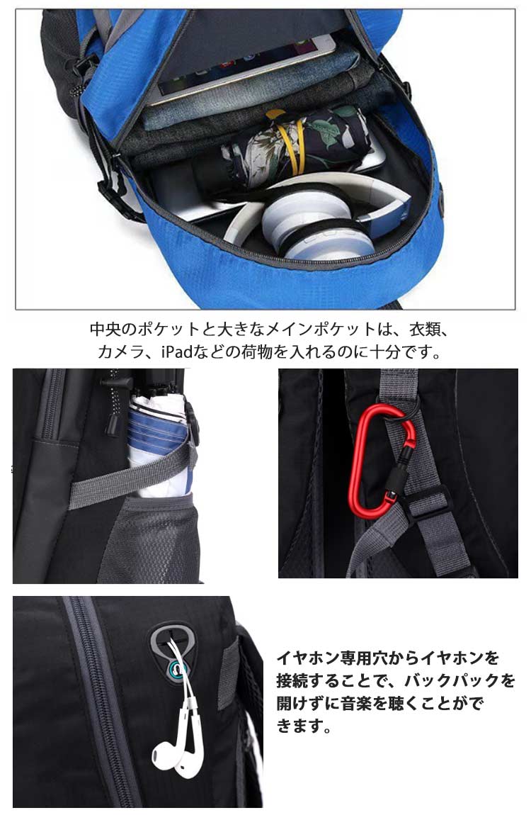 【登山リュック】【軽量・撥水加工】【40Lの大容量】日帰り登山から一泊程度のキャンプにも対応できるリュックです。シンプルなのに、収納力抜群!外側の小さなポケットは携帯電話、充電器、鍵、コイン・カギなどの小物を携帯するのに便利です。中央のポケットと大きなメインポケットは、衣類、カメラ、iPadなどの荷物を入れるのに十分です。表地は傷などが付きにくい高密度の生地を使用し、作りも丈夫なので、耐水、耐摩耗性、耐久性を実現できます。イヤホン専用穴からイヤホンを接続することで、バックパックを開けずに音楽を聴くことができます。登山、ハイキング、キャンプ、トレッキング、野外フェス、旅行、タウンユースでも大活躍。