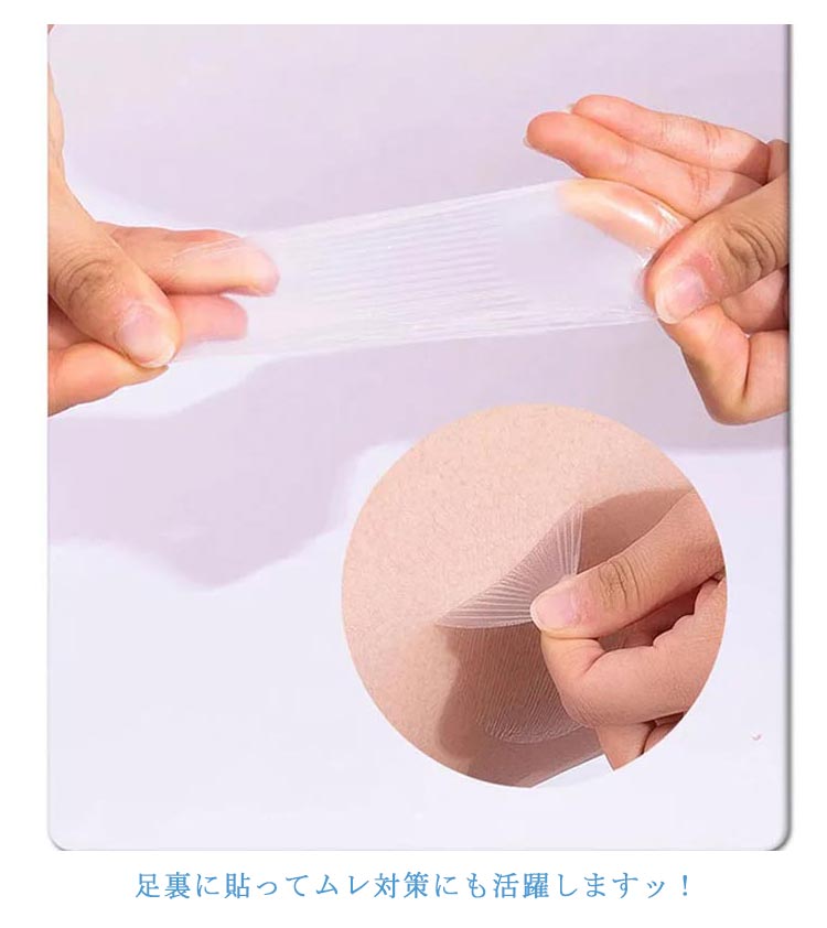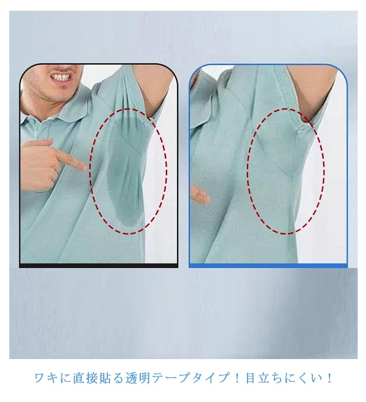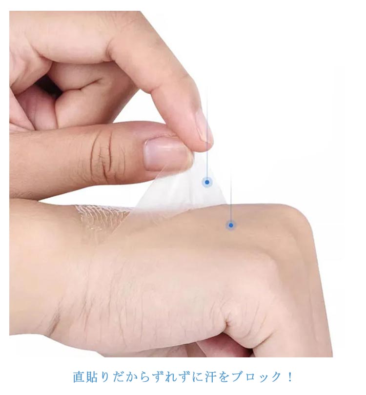 | 目立たずに汗の悩みをサラリっと解決!!汚れを防ぐ! ワキに直接貼る透明テープタイプ!目立ちにくい! 直貼りだからずれずに汗をブロック! 足裏に貼ってムレ対策にも活躍しますッ! 男女を問わず、誰でもお使っていただけます。 | |