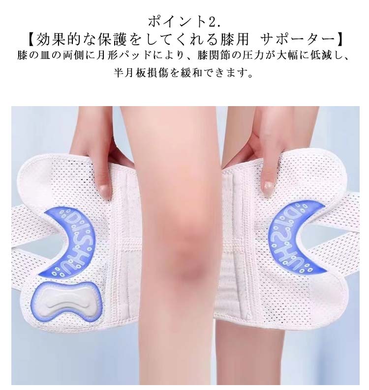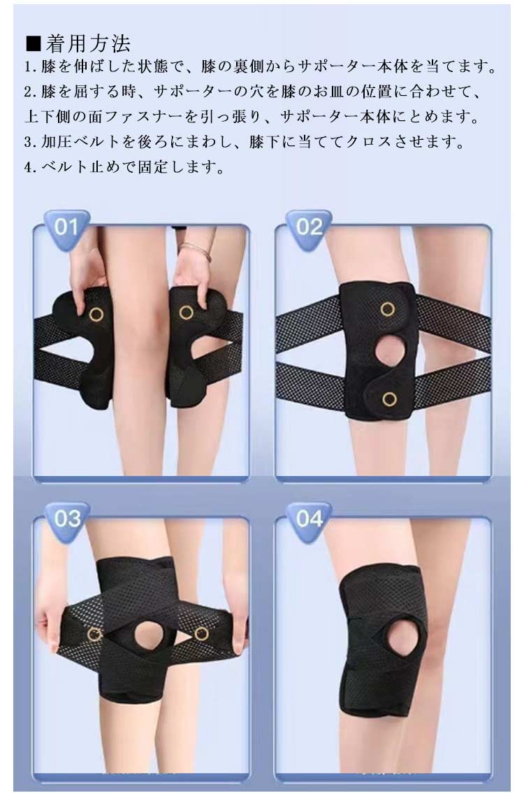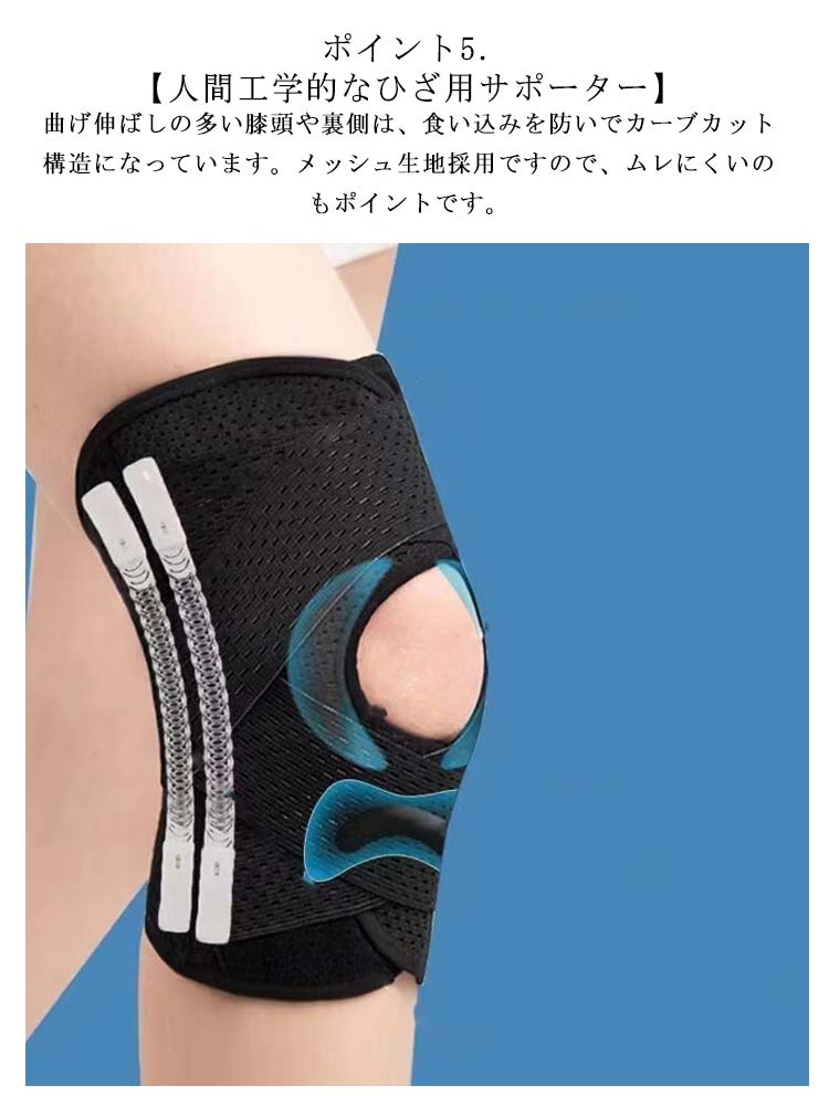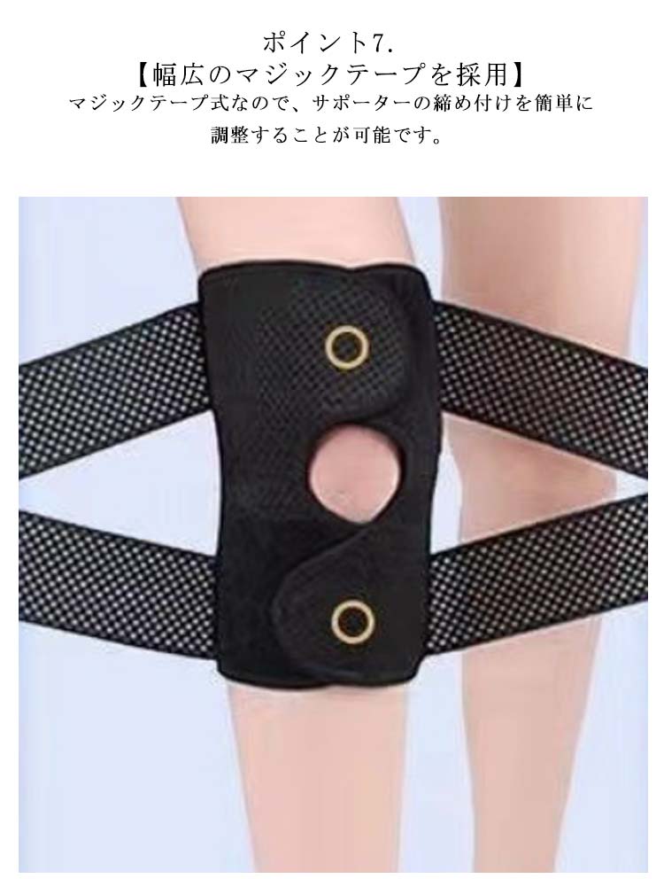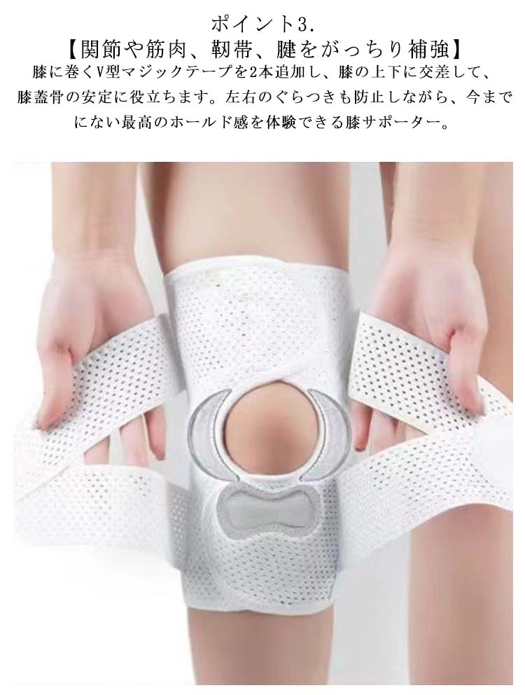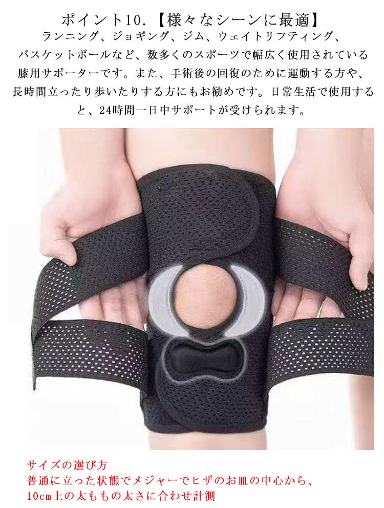 ポイント1.【再発防止と痛み対策の両方にアプローチ】傷ついた筋肉、靭帯、腱にテーピングやサポーターを用いることで、その部位の補強ができ、怪我の再発防止や悪化防止につながります。ポイント2.【効果的な保護をしてくれる膝用 サポーター】膝の皿の両側に月形パッドにより、膝関節の圧力が大幅に低減し、半月板損傷を緩和できます。ポイント3.【関節や筋肉、靭帯、腱をがっちり補強】膝に巻くV型マジックテープを2本追加し、膝の上下に交差して、膝蓋骨の安定に役立ちます。左右のぐらつきも防止しながら、今までにない最高のホールド感を体験できる膝サポーター。ポイント4.【デュアルスタビライザースプリング】膝サポーターの両側に2本ずつのスプリングを内蔵し、関節の自然な動きとともに流れるように設計されており、運動や激しい活動時に着用するのに理想的なブレースです。ポイント5.【人間工学的なひざ用サポーター】曲げ伸ばしの多い膝頭や裏側は、食い込みを防いでカーブカット構造になっています。メッシュ生地採用ですので、ムレにくいのもポイントです。ポイント6.【フロントオープンのデザイン】膝蓋骨のカーブに360°完全にフィットし、損傷の回復とスポーツによる怪我に。ポイント7.【幅広のマジックテープを採用】マジックテープ式なので、サポーターの締め付けを簡単に調整することが可能です。ポイント8.【いつでも快適な着用感】このひざサポーターは通気性、吸汗速乾性に優れ、汗をかいてもサラッと快適です。ポイント9.【簡単に着け外しOK】ボトムを履いたまま簡単に着け外しできるフルオープンタイプの膝サポーターです。ポイント10.【様々なシーンに最適】ランニング、ジョギング、ジム、ウェイトリフティング、バスケットボールなど、数多くのスポーツで幅広く使用されている膝用サポーターです。また、手術後の回復のために運動する方や、長時間立ったり歩いたりする方にもお勧めです。日常生活で使用すると、24時間一日中サポートが受けられます。サイズの選び方普通に立った状態でメジャーでヒザのお皿の中心から、10cm上の太ももの太さに合わせ計測■着用方法1.膝を伸ばした状態で、膝の裏側からサポーター本体を当てます。2.膝を屈する時、サポーターの穴を膝のお皿の位置に合わせて、上下側の面フ