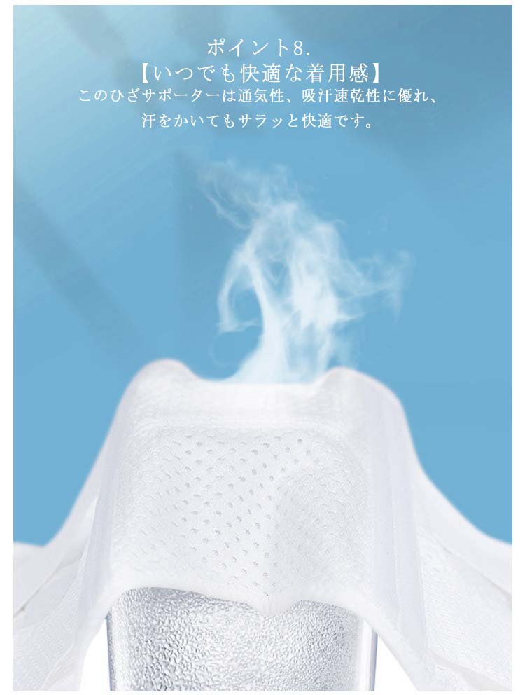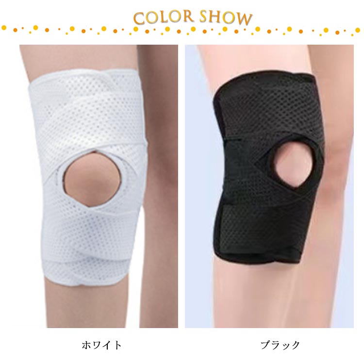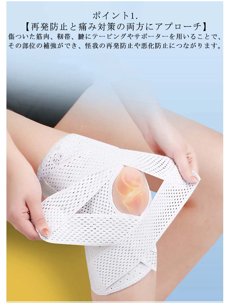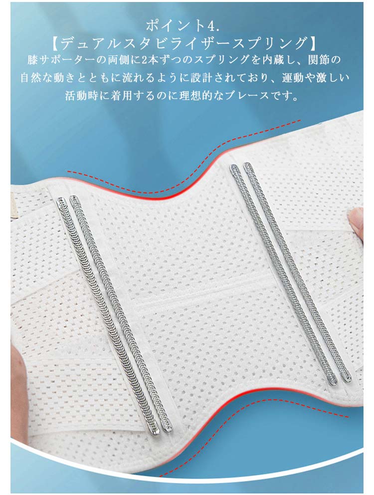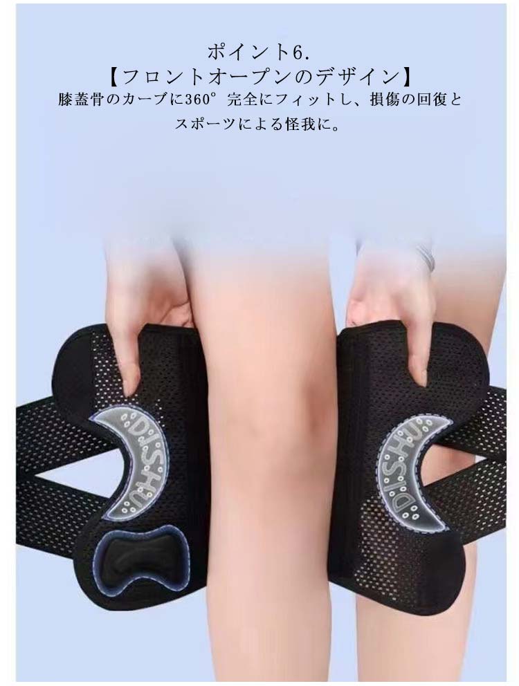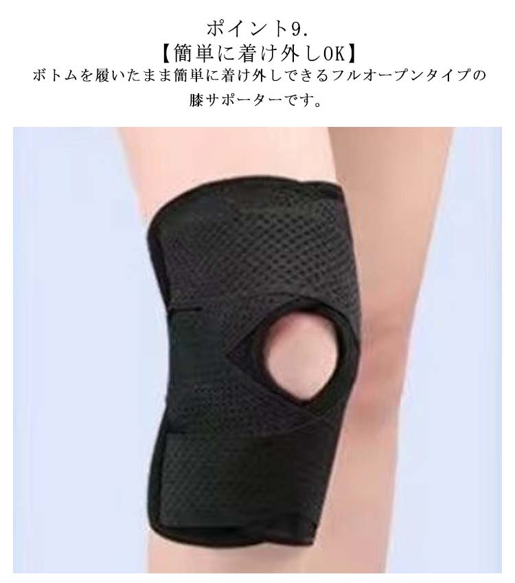 ポイント1.【再発防止と痛み対策の両方にアプローチ】傷ついた筋肉、靭帯、腱にテーピングやサポーターを用いることで、その部位の補強ができ、怪我の再発防止や悪化防止につながります。ポイント2.【効果的な保護をしてくれる膝用 サポーター】膝の皿の両側に月形パッドにより、膝関節の圧力が大幅に低減し、半月板損傷を緩和できます。ポイント3.【関節や筋肉、靭帯、腱をがっちり補強】膝に巻くV型マジックテープを2本追加し、膝の上下に交差して、膝蓋骨の安定に役立ちます。左右のぐらつきも防止しながら、今までにない最高のホールド感を体験できる膝サポーター。ポイント4.【デュアルスタビライザースプリング】膝サポーターの両側に2本ずつのスプリングを内蔵し、関節の自然な動きとともに流れるように設計されており、運動や激しい活動時に着用するのに理想的なブレースです。ポイント5.【人間工学的なひざ用サポーター】曲げ伸ばしの多い膝頭や裏側は、食い込みを防いでカーブカット構造になっています。メッシュ生地採用ですので、ムレにくいのもポイントです。ポイント6.【フロントオープンのデザイン】膝蓋骨のカーブに360°完全にフィットし、損傷の回復とスポーツによる怪我に。ポイント7.【幅広のマジックテープを採用】マジックテープ式なので、サポーターの締め付けを簡単に調整することが可能です。ポイント8.【いつでも快適な着用感】このひざサポーターは通気性、吸汗速乾性に優れ、汗をかいてもサラッと快適です。ポイント9.【簡単に着け外しOK】ボトムを履いたまま簡単に着け外しできるフルオープンタイプの膝サポーターです。ポイント10.【様々なシーンに最適】ランニング、ジョギング、ジム、ウェイトリフティング、バスケットボールなど、数多くのスポーツで幅広く使用されている膝用サポーターです。また、手術後の回復のために運動する方や、長時間立ったり歩いたりする方にもお勧めです。日常生活で使用すると、24時間一日中サポートが受けられます。サイズの選び方普通に立った状態でメジャーでヒザのお皿の中心から、10cm上の太ももの太さに合わせ計測■着用方法1.膝を伸ばした状態で、膝の裏側からサポーター本体を当てます。2.膝を屈する時、サポーターの穴を膝のお皿の位置に合わせて、上下側の面フ