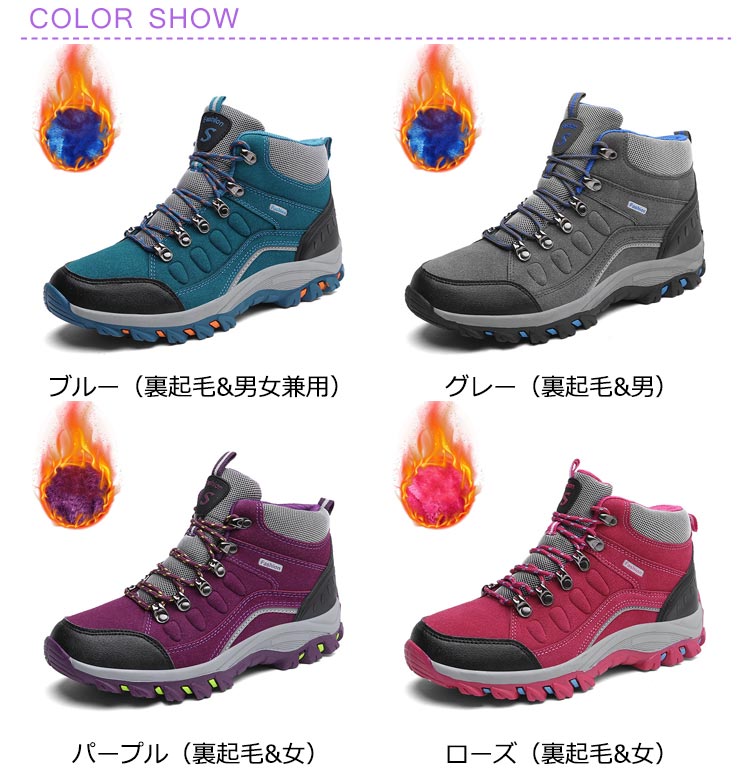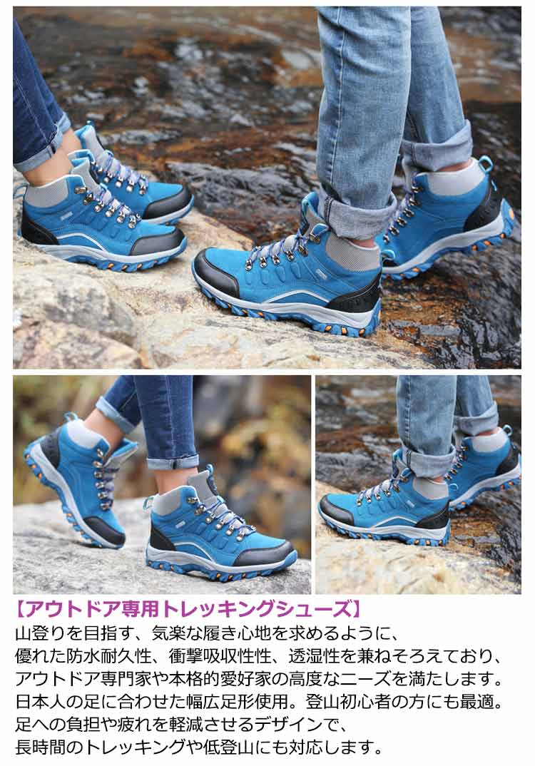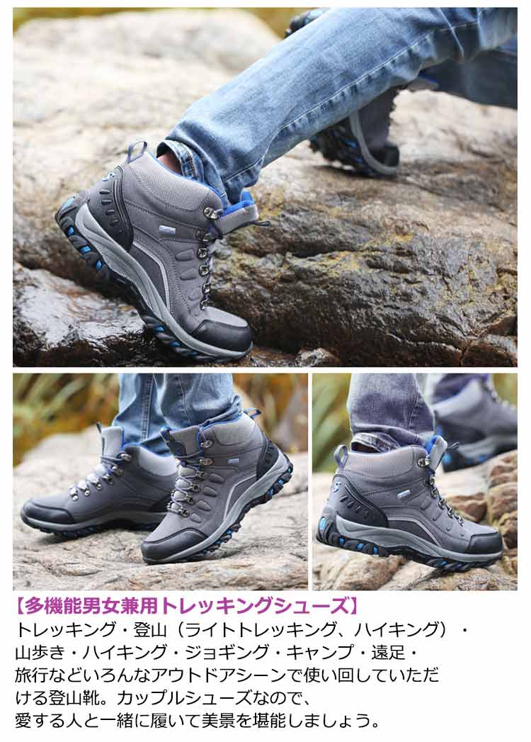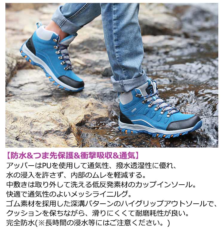 【裏起毛あり/なし】トレッキングや軽登山はもちろん普段のウォーキングや休日のキャンプでも使用できるアウトドアシューズです。【防水&つま先保護&衝撃吸収&通気】アッパーはPUを使用して通気性、撥水透湿性に優れ、水の浸入を許さず、内部のムレを軽減する。中敷きは取り外して洗える低反発素材のカップインソール。快適で通気性のよいメッシライニルグ。ゴム素材を採用した深溝パターンのハイグリップアウトソールで、クッションを保ちながら、滑りにくくて耐磨耗性が良い。完全防水(※長時間の浸水等にはご注意ください。)【アウトドア専用トレッキングシューズ】山登りを目指す、気楽な履き心地を求めるように、優れた防水耐久性、衝撃吸収性性、透湿性を兼ねそろえており、アウトドア専門家や本格的愛好家の高度なニーズを満たします。日本人の足に合わせた幅広足形使用。登山初心者の方にも最適。足への負担や疲れを軽減させるデザインで、長時間のトレッキングや低登山にも対応します。【多機能男女兼用トレッキングシューズ】トレッキング・登山(ライトトレッキング、ハイキング)・山歩き・ハイキング・ジョギング・キャンプ・遠足・旅行などいろんなアウトドアシーンで使い回していただける登山靴。カップルシューズなので、愛する人と一緒に履いて美景を堪能しましょう。