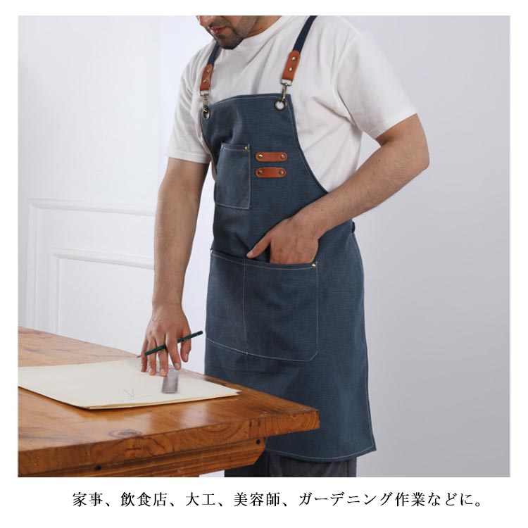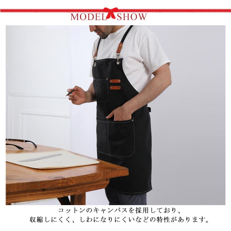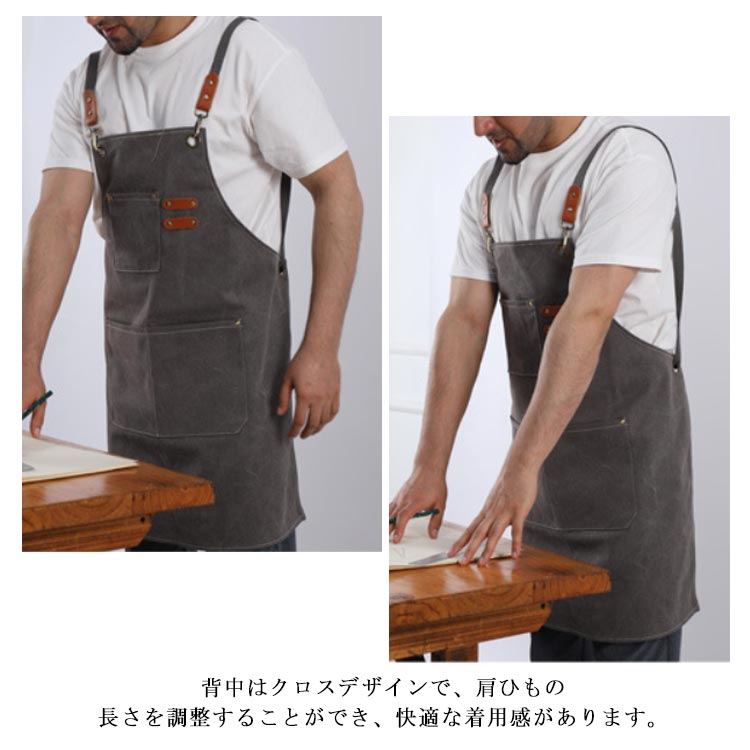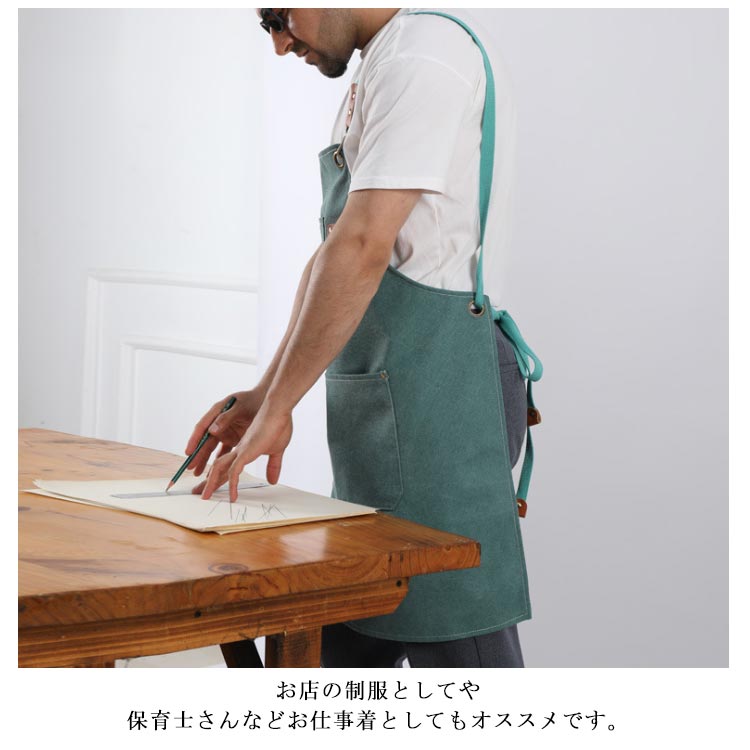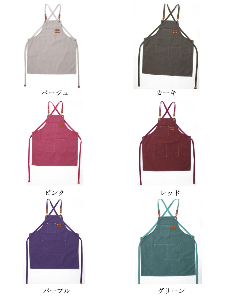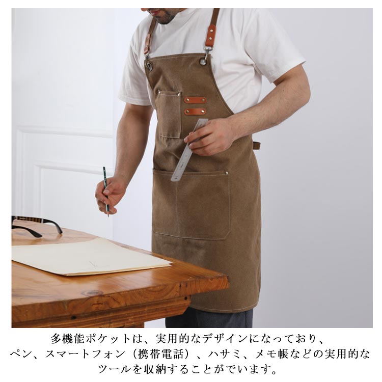 | オシャレでカッコイイエプロン。 コットンのキャンバスを採用しており、収縮しにくく、しわになりにくいなどの特性があります。 背中はクロスデザインで、肩ひもの長さを調整することができ、快適な着用感があります。 多機能ポケットは、実用的なデザインになっており、ペン、スマートフォン(携帯電話)、ハサミ、メモ帳などの実用的なツールを収納することがでいます。 家事、飲食店、大工、美容師、ガーデニング作業などに。 お店の制服としてや保育士さんなどお仕事着としてもオススメです。 | |