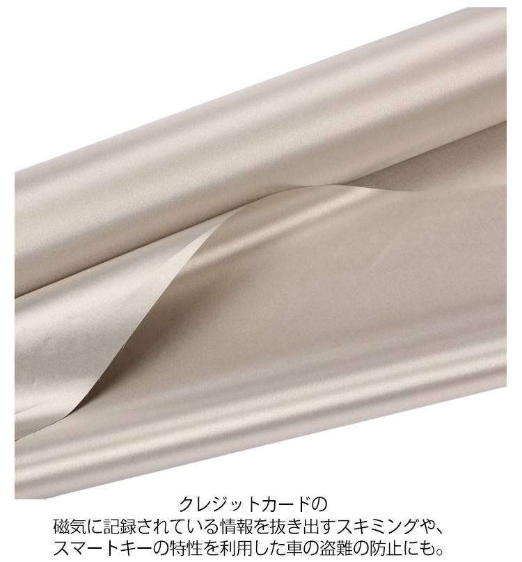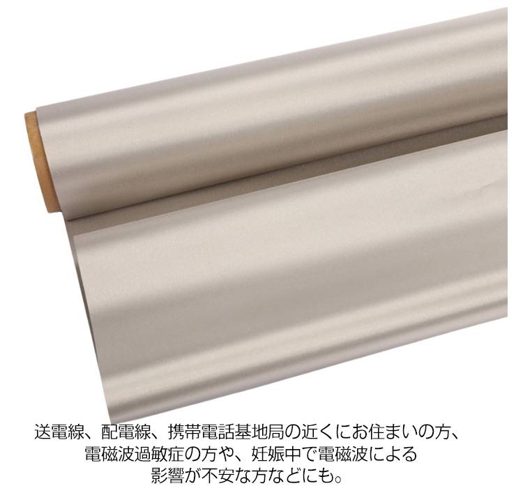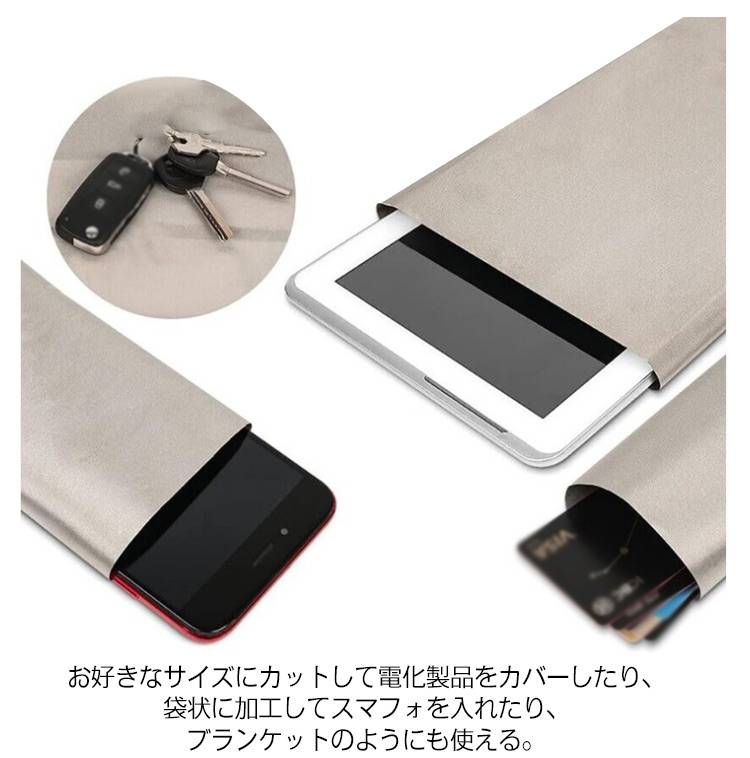 身の回りの電磁波が気になる電化製品(PC・スマートフォン・TV・無線ルーター・電子レンジなど)の電磁波を遮断するシート。お好きなサイズにカットして電化製品をカバーしたり、袋状に加工してスマフォを入れたり、ブランケットのようにも使える。ドライブレコーダー設置によるカーナビ、ワンセグ、ラジオ、スマートキーとの電波干渉やノイズ発生の対策などにも使える。クレジットカードの磁気に記録されている情報を抜き出すスキミングや、スマートキーの特性を利用した車の盗難の防止にも。送電線、配電線、携帯電話基地局の近くにお住まいの方、電磁波過敏症の方や、妊娠中で電磁波による影響が不安な方などにも。