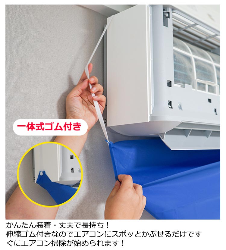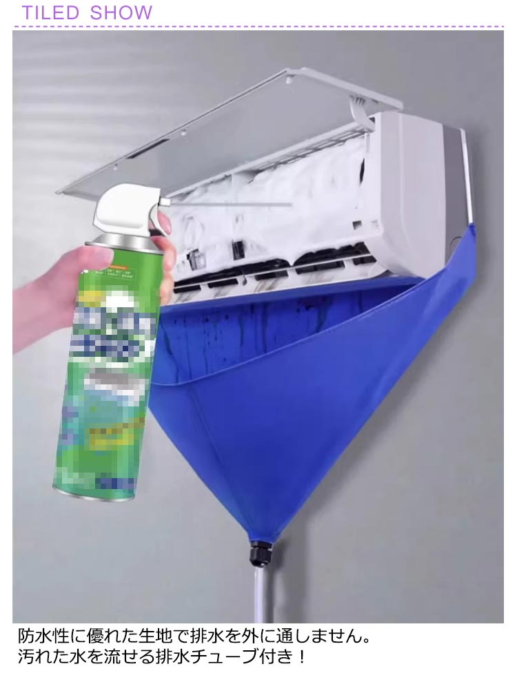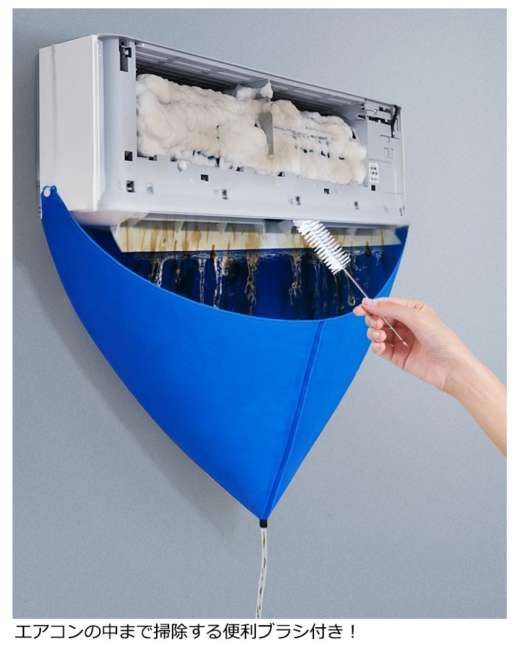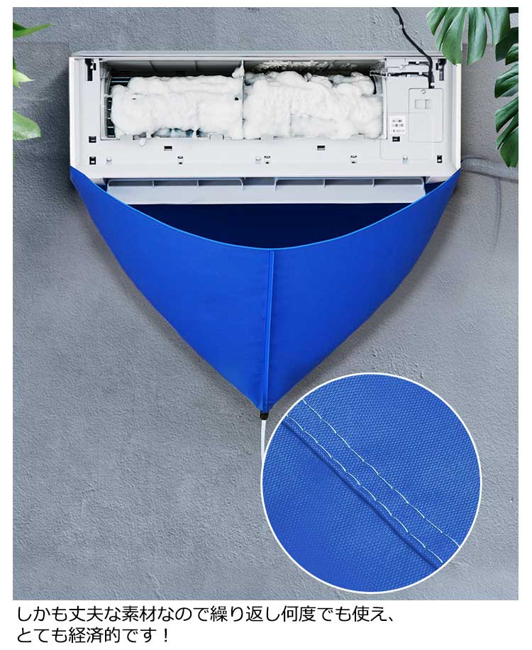 エアコンクリーニングに必須の壁掛用エアコン洗浄カバーセット!防水性に優れた生地で排水を外に通しません。汚れた水を流せる排水チューブ付き!エアコンの中まで掃除する便利ブラシ付き!エアコン洗浄カバーは、エアコンの取り外し、取り付けという作業を減らし、設置したままの状態で洗浄を可能にしました。かんたん装着・丈夫で長持ち!伸縮ゴム付きなのでエアコンにスポッとかぶせるだけですぐにエアコン掃除が始められます!しかも丈夫な素材なので繰り返し何度でも使え、とても経済的です!