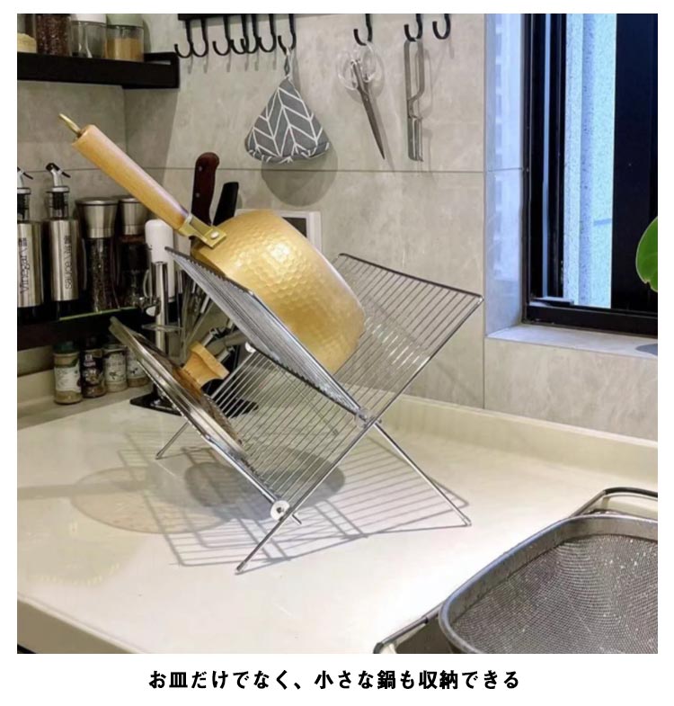 | 使うときだけサッと広げて使える2段折り畳み式ディッシュラック。 使用しないときは折りたたんでスリムになるので、狭いキッチンでも作業スペースの邪魔になりません。 お皿だけでなく、小さな鍋も収納できる メインのディッシュラックとしてはもちろん、洗い物が増えるときのサブとして備えておいても安心です。 立てて置くと食器が重ならず、水切れよく早く乾くのも嬉しいですね。 | |