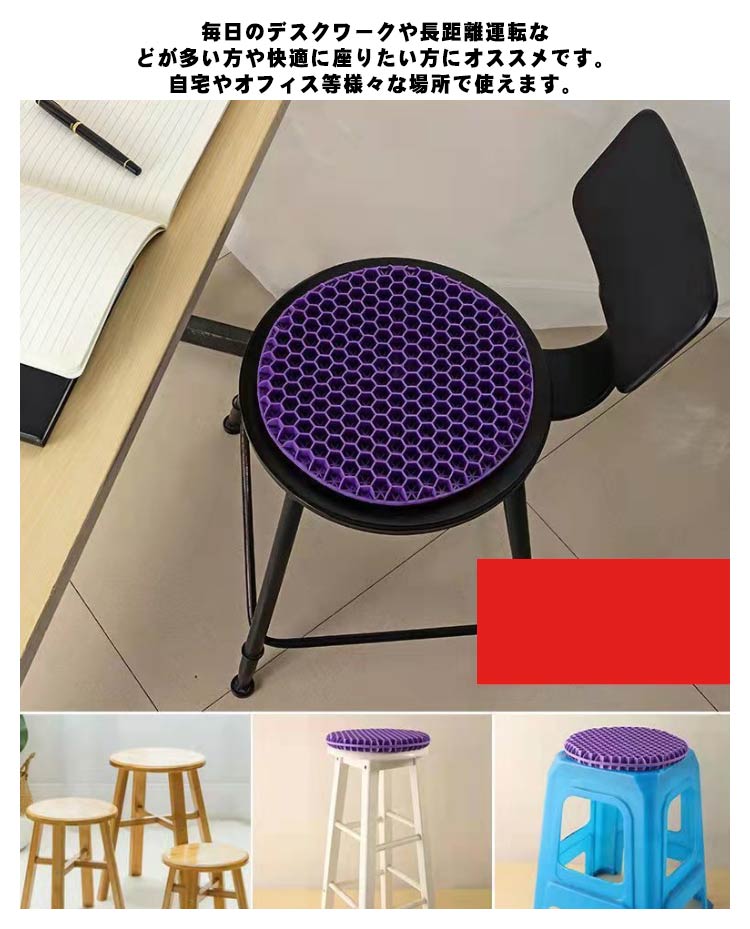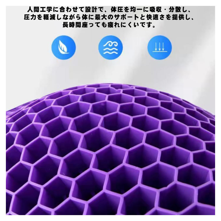 丸型ゲルクッション。洗濯できるクッションカバー付き!人間工学に合わせて設計で、体圧を均一に吸収・分散し、圧力を軽減しながら体に最大のサポートと快適さを提供し、長時間座っても疲れにくいです。暑さを吸収・分散してサポートし正しい姿勢を保ちます。柔ら材質で椅子にも使えます、平らな椅子の表面に直接座るよりも座り心地がよい。高弾性ゲル材料の特徴で、いくらストレッチ、絞ってもすぐ元に戻します、経済的にも性能的にも普通のクッションより優れております。毎日のデスクワークや長距離運転などが多い方や快適に座りたい方にオススメです。自宅やオフィス等様々な場所で使えます。敬老の日、父の日、母の日、お誕生日などご家族やご友人へのギフト・プレゼントにも人気です。