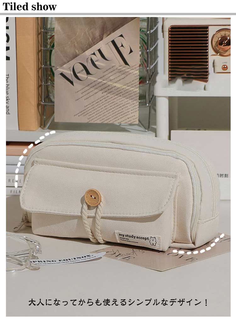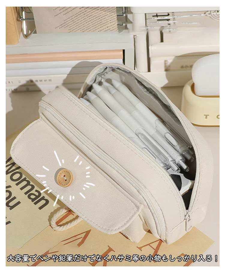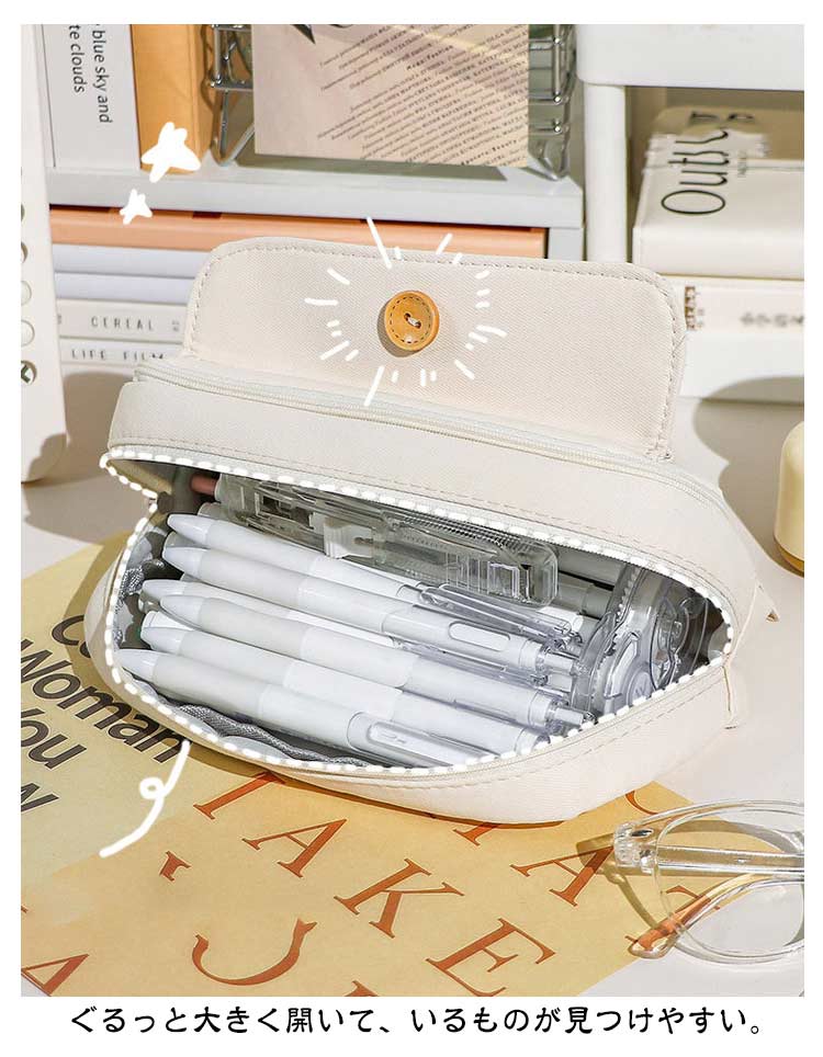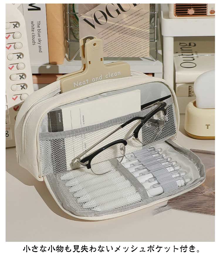 | 文房具を立たせて収納するので、中身が一覧しやすく、机上で省スペースに使えます。 ぐるっと大きく開いて、いるものが見つけやすい。 大人になってからも使えるシンプルなデザイン! 大容量でペンや鉛筆だけでなくハサミ等の小物もしっかり入る! 小さな小物も見失わないメッシュポケット付き。 | |