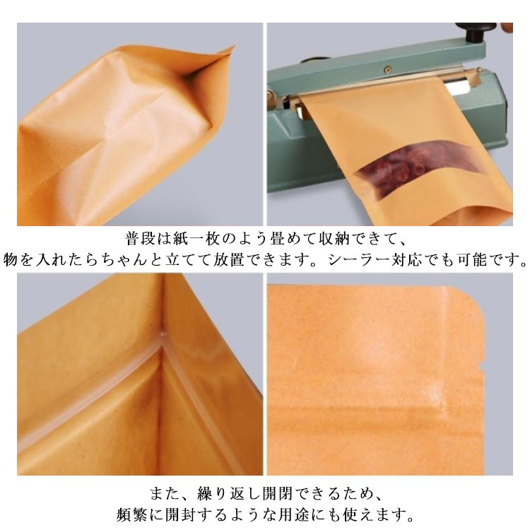 自立する形状 底部はマチがあるから自立することができます。容量が大きくなりながら収納も便利です。普段は紙一枚のよう畳めて収納できて、物を入れたらちゃんと立てて放置できます。シーラー対応でも可能です。防湿性・遮光性・気密性に優れているので、美味しさを損なう「空気」や「湿気」、「光」などから食品を守ります。窓付袋ですから、袋の中身が一目で分かれます。デザートの包装や薬品管理など適用しています。封入口にチャックを設けた紙袋です。ワンタッチで密封できるので、ホコリや汚れの進入を防止でき、大変衛生的です。また、繰り返し開閉できるため、頻繁に開封するような用途にも使えます。