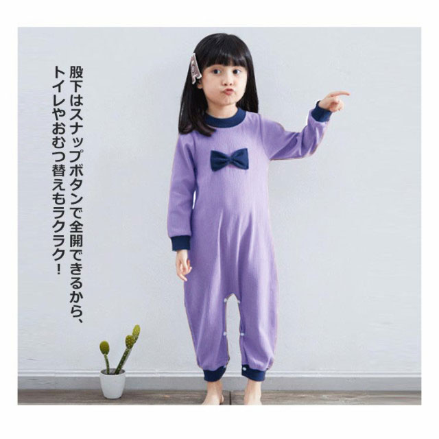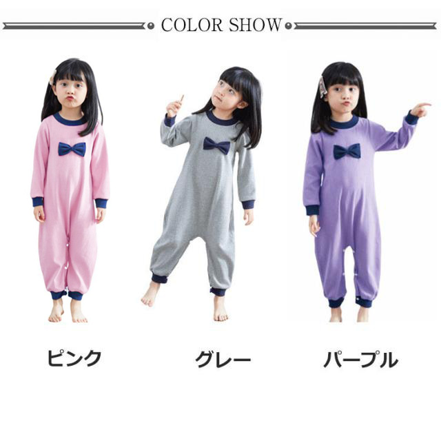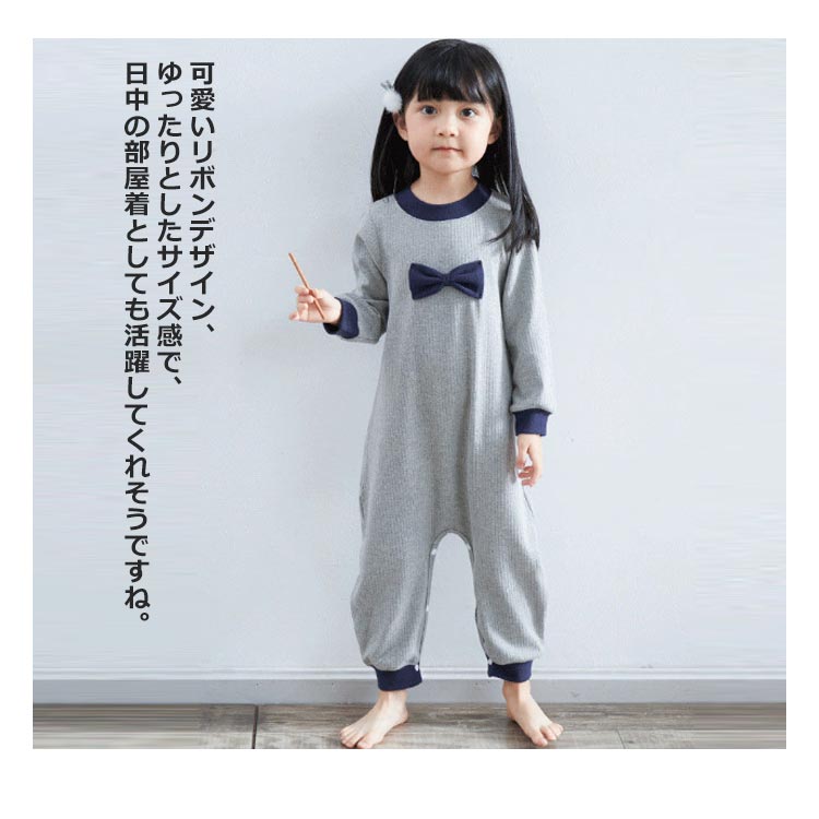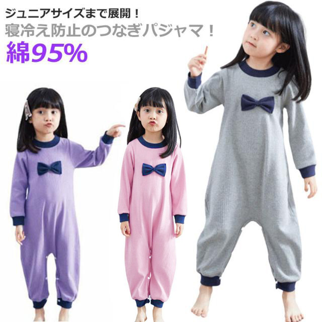 | ジュニアサイズまで展開!寝冷え防止のつなぎパジャマ! 90cmサイズから160cmサイズまでを取り揃え、小学生/中学生も着用できるようになっている。 つなぎタイプなので、寝ている間にお腹が冷えてしまう心配もありません。 肌触り優しい綿95%生地で、通気性?吸汗性も抜群、大切なお子様により快適な快眠を◎ 股下はスナップボタンで全開できるから、トイレやおむつ替えもラクラク! 可愛いリボンデザイン、ゆったりとしたサイズ感で、日中の部屋着としても活躍してくれそうですね。 | |