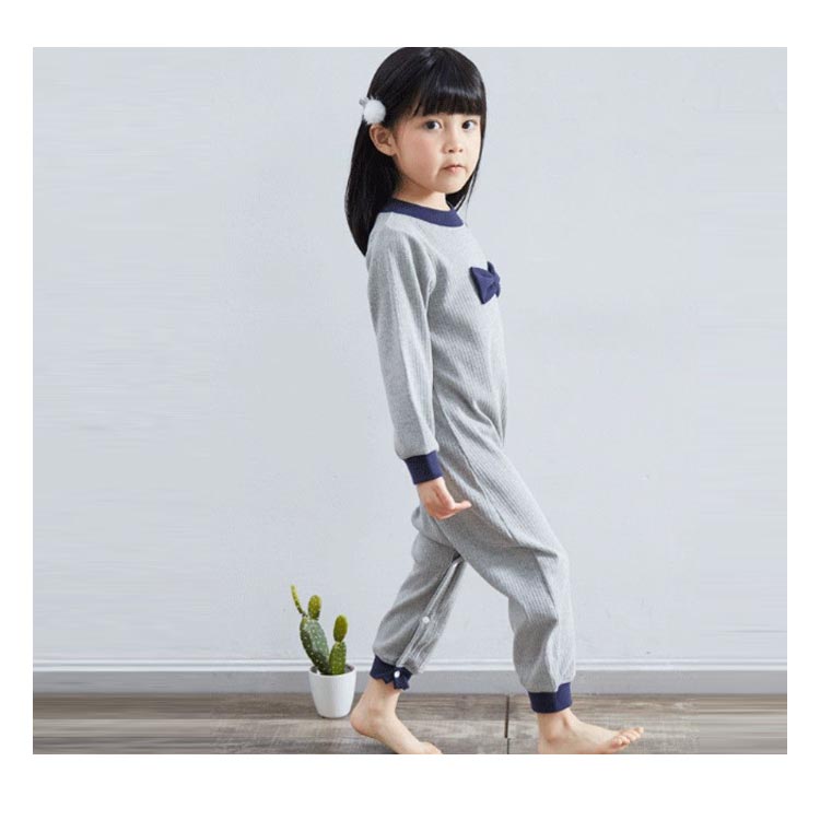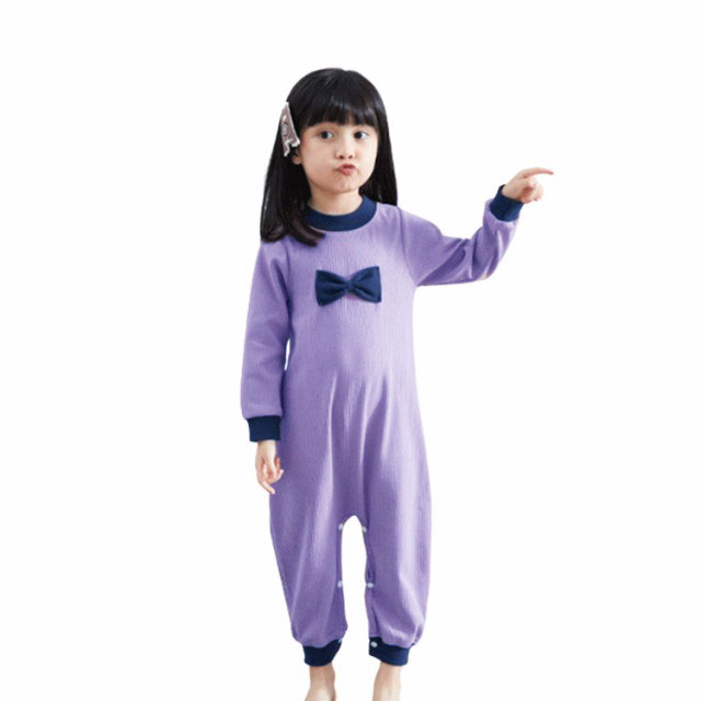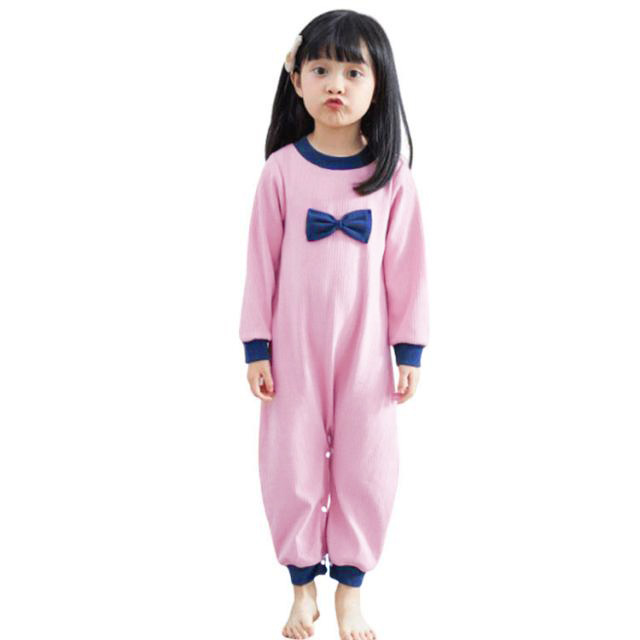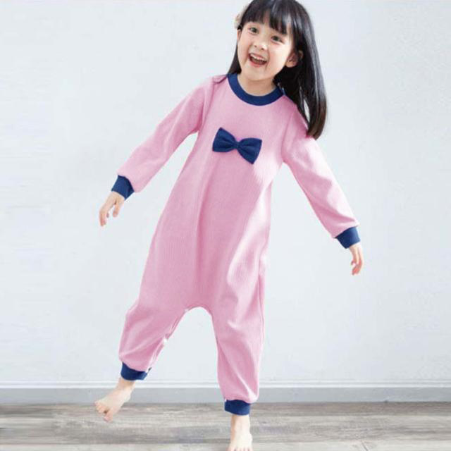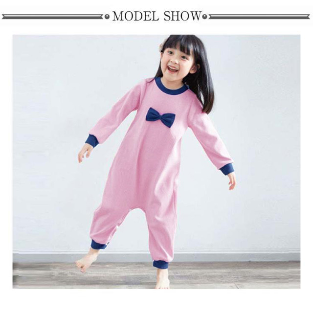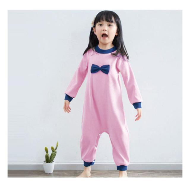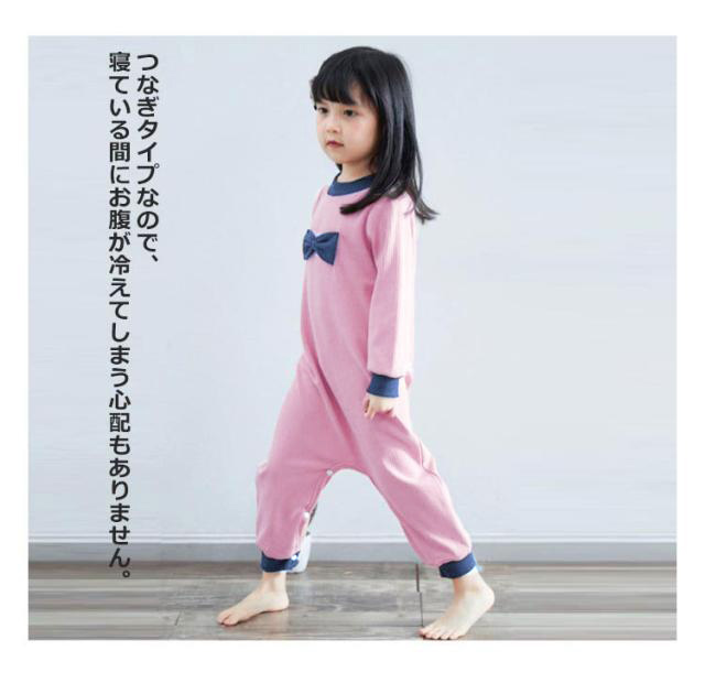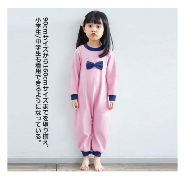 ジュニアサイズまで展開!寝冷え防止のつなぎパジャマ!90cmサイズから160cmサイズまでを取り揃え、小学生/中学生も着用できるようになっている。つなぎタイプなので、寝ている間にお腹が冷えてしまう心配もありません。肌触り優しい綿95%生地で、通気性・吸汗性も抜群、大切なお子様により快適な快眠を◎股下はスナップボタンで全開できるから、トイレやおむつ替えもラクラク!可愛いリボンデザイン、ゆったりとしたサイズ感で、日中の部屋着としても活躍してくれそうですね。