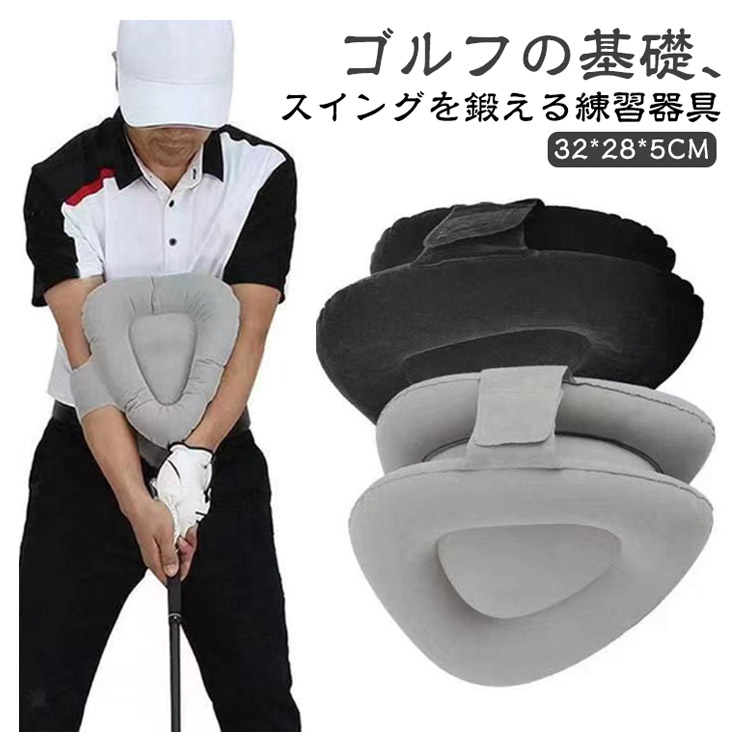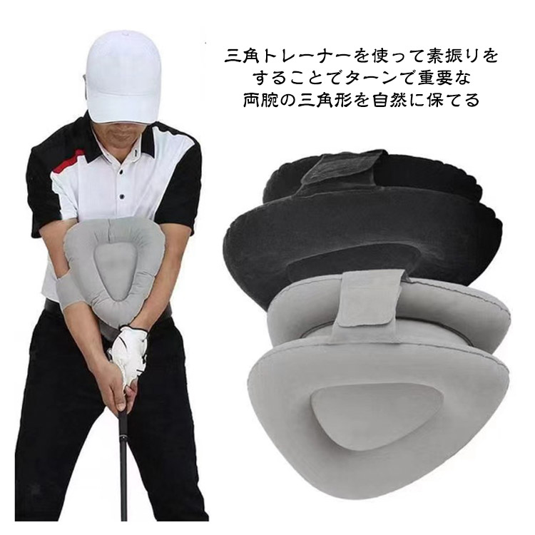 ゴルフの基礎、スイングを鍛える練習器具 三角トレーナーを使って素振りをすることでターンで重要な両腕の三角形を自然に保てる 使わないときは空気を抜いてコンパクトに ドライバーからアイアン、パターまで、ボディーターンの基本、両腕の三角形を保つコツが学べる! よりコンパクトになって、フィット感が増し。 エアー注入量の調整でさらにフィット感アップ!