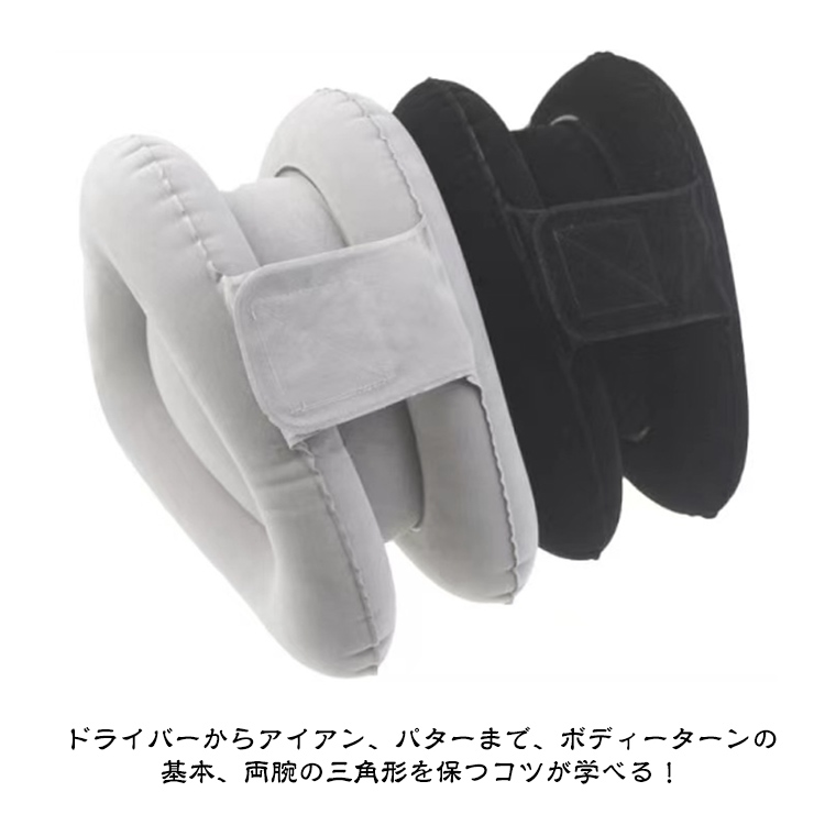 ゴルフの基礎、スイングを鍛える練習器具三角トレーナーを使って素振りをすることでターンで重要な両腕の三角形を自然に保てる使わないときは空気を抜いてコンパクトにドライバーからアイアン、パターまで、ボディーターンの基本、両腕の三角形を保つコツが学べる! よりコンパクトになって、フィット感が増し。エアー注入量の調整でさらにフィット感アップ!