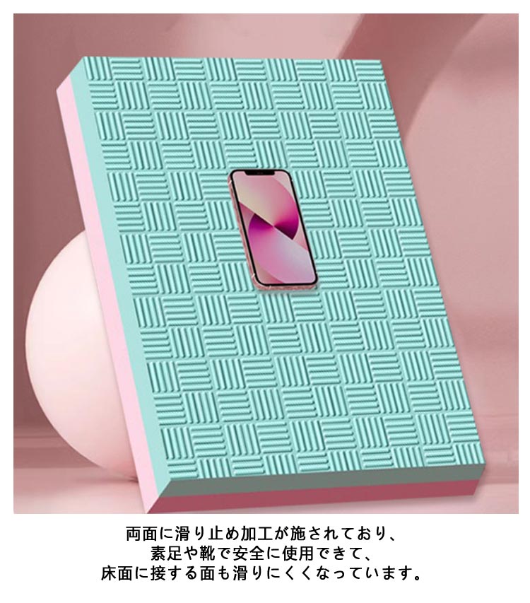 体の動きの土台となる体幹を鍛えるバランスマットです。環境にやさしい高密度、無臭のTPE素材を採用し、弾力性を持ってすぐに形状を復元することができ、汗にも強い特徴があります。軽量のため自宅からワークアウトまで簡単に持ち運ぶことができます。両面に滑り止め加工が施されており、素足や靴で安全に使用できて、床面に接する面も滑りにくくなっています。トレーニング、ヨガ、ストレッチ、エクササイズ、姿勢矯正のためのチェアマットなど、様々な用途にお使いいただけます。マットの上に片足、両足で直立するだけでも、バランス、可動性、筋力、運動能力を向上させます。