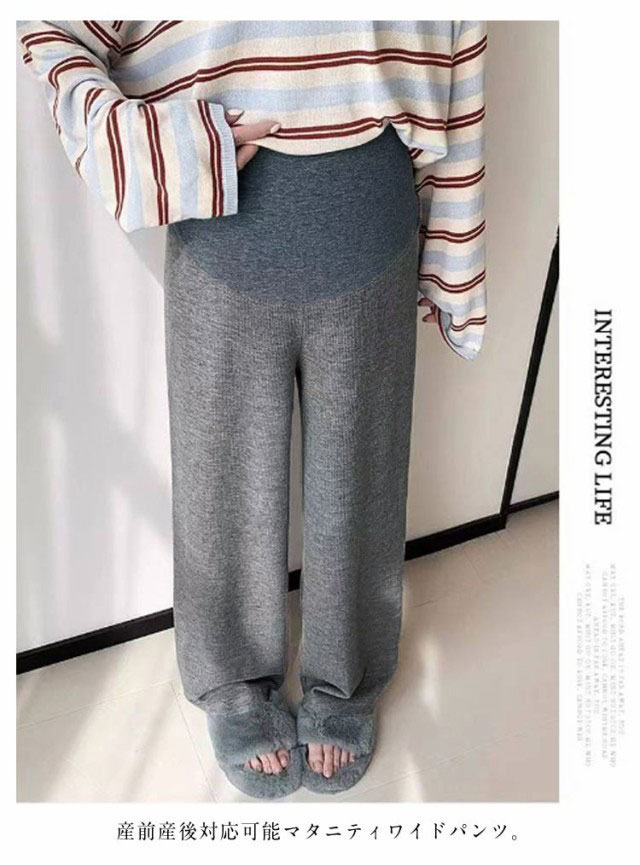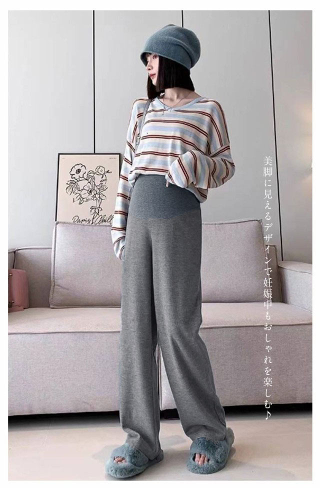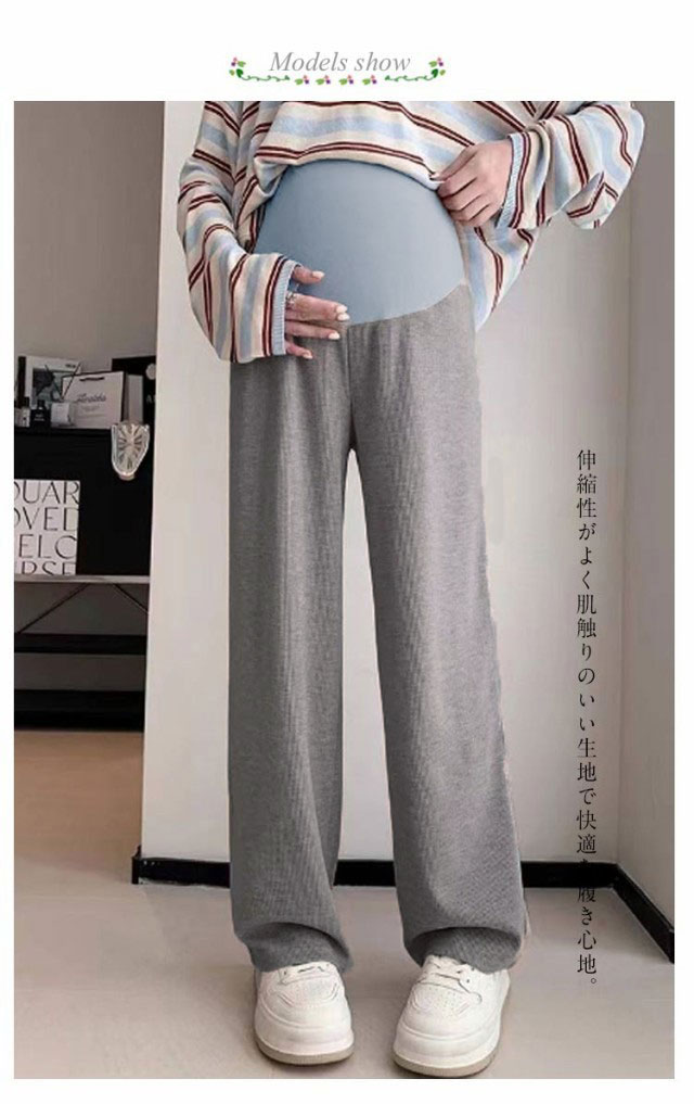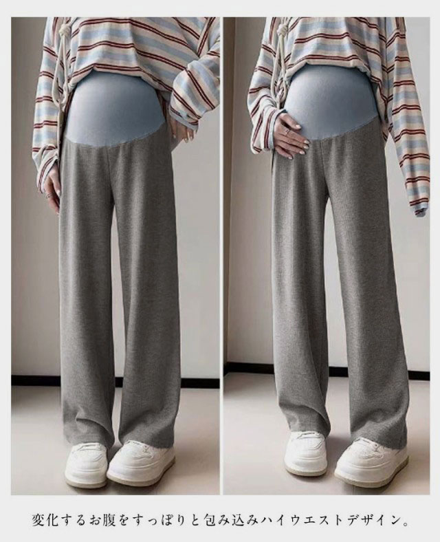 おしゃれなマタニティワイドパンツ。伸縮性がよく肌触りのいい生地で快適な履き心地。変化するお腹をすっぽりと包み込みハイウエストデザイン。美脚に見えるデザインで妊娠中もおしゃれを楽しむ♪産前産後対応可能マタニティワイドパンツ。