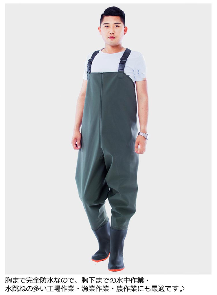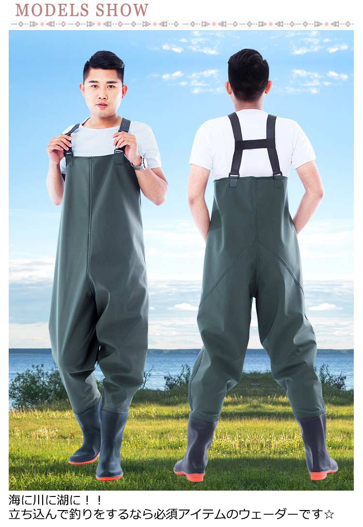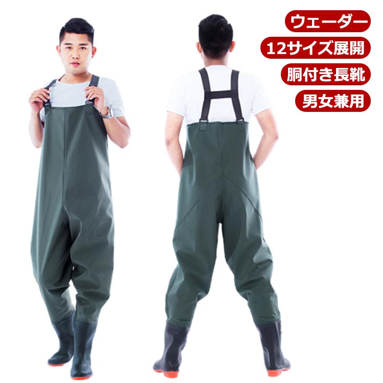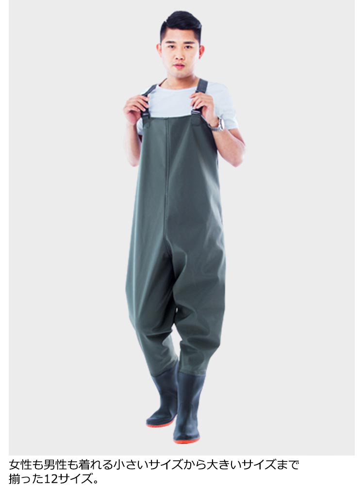 【ウェーダー】【12サイズ展開】【男女兼用】【胴付き長靴】海に川に湖に!!立ち込んで釣りをするなら必須アイテムのウェーダーです☆胸まで完全防水なので、胸下までの水中作業・水跳ねの多い工場作業・漁業作業・農作業にも最適です♪通気性が良い生地およびPVCコーティング仕上げ、耐水性、耐酸性、耐アルカリ性といった性質を持ちます。ちょっとした小物や鍵も入れられる、便利な胸ポケット付。滑り止め靴底で、渓流、小池、泥沼などの中に渉っても安定的です。苔生した場所や海苔や海草のついた岩場でも滑りにくく安心。H形のサスペンダーは調整可能で、大きいサイズもご用意しており、様々な体型にフィットします。デザインによって、ワンタッチ脱着できます。女性も男性も着れる小さいサイズから大きいサイズまで揃った12サイズ。土砂災害、土砂崩れ、台風、河川の氾濫、洪水など、万一の災害時の復興やボランティアの際に。防災の備えとして。