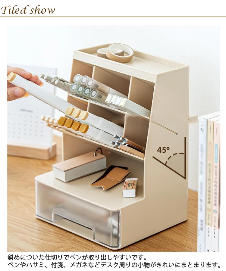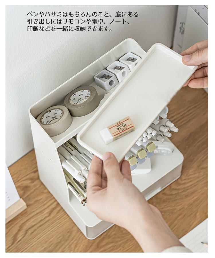 | デスク周りに散らかりがちな文房具をすっきり収納できるペンスタンド。 ペンやハサミはもちろんのこと、底にある引き出しにはリモコンや電卓、ノート、印鑑などを一緒に収納できます。 斜めについた仕切りでペンが取り出しやすいです。ペンやハサミ、付箋、メガネなどデスク周りの小物がきれいにまとまります。 文具以外にも、化粧品や化粧ブラシなどの小物収納ケースとしても良さそうです。 自宅のデスク周り、シンプルなフォルムだからオフィスにもオススメです。 | |