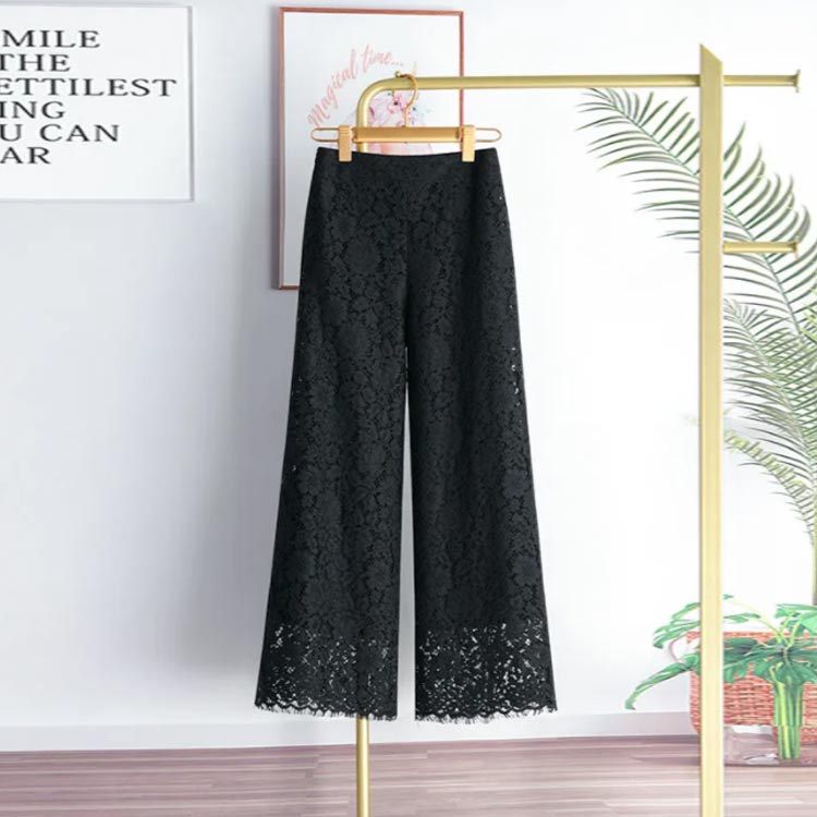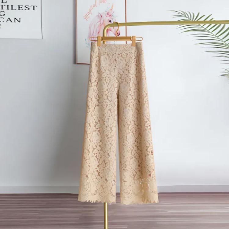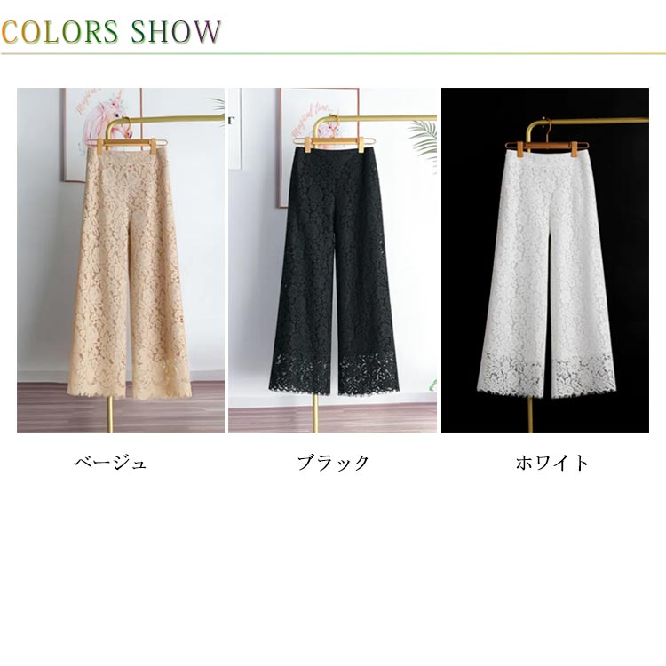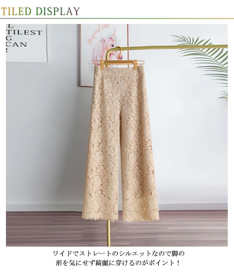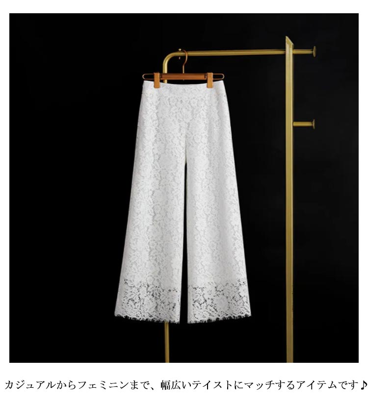 高級感のある花柄総レースが華やか!レース地で春の気分を取り入れられるワイドパンツ。ワイドでストレートのシルエットなので脚の形を気にせず綺麗に穿けるのがポイント!裏地が付いているので透け感の心配なく履いていただけます。ウエストのゴム仕様で、ストレスフリーな穿き心地◎カジュアルからフェミニンまで、幅広いテイストにマッチするアイテムです♪