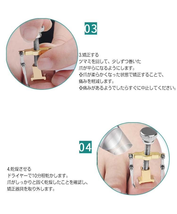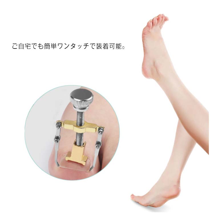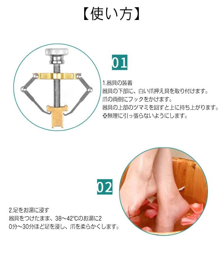 巻き爪・陥入爪の矯正!ご自宅でも簡単ワンタッチで装着可能。ケース付きだから器具の収納に便利です。【使い方】1.器具の装着器具の下部に、白い爪押え具を取り付けます。爪の両側にフックをかけます。器具の上部のツマミを回すと上に持ち上がります。※無理に引っ張らないようにします。2.足をお湯に浸す器具をつけたまま、38~42℃のお湯に20分~30分ほど足を浸し、爪を柔らかくします。3.矯正するツマミを回して、少しずつ巻いた爪が平らになるようにします。※爪が柔らかくなった状態で矯正することで、痛みを軽減します。※痛みがあるようでしたらすぐに中止してください。4.乾燥させるドライヤーで10分程乾かします。爪がしっかりと固く乾燥したことを確認し、矯正器具を取り外します。5.隙間のケア巻き爪がひどい場合、爪と皮膚の間に隙間ができます。間にコットン等を挟んでおくと効果的です。【使用上の注意】・本品は治療用ではありません。・痛みがある場合はすぐにご使用を中止してください。・痛みのない範囲で、数回に分けて少しずつ改善していくようにしてください。・巻き爪の程度がひどい場合には使用できません。