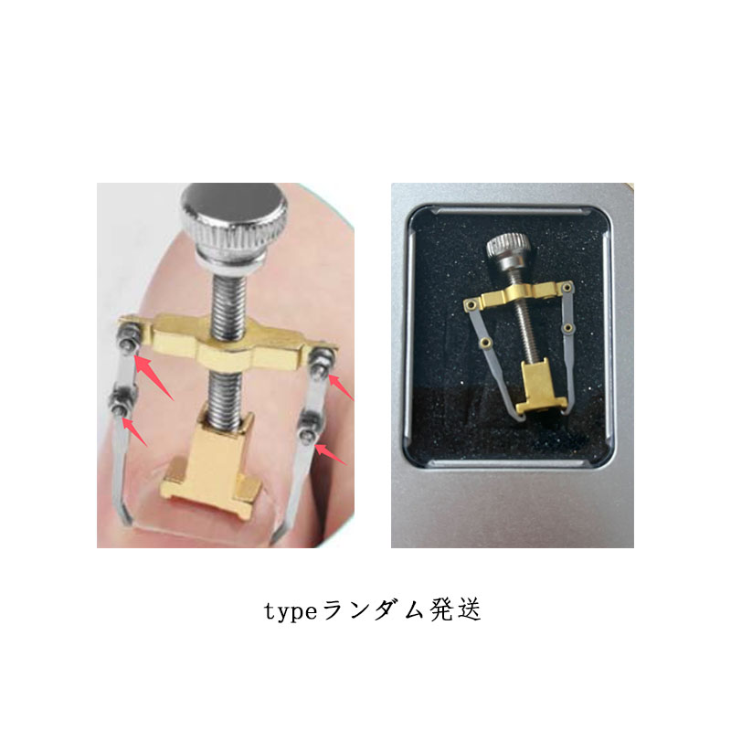 | 巻き爪?陥入爪の矯正! ご自宅でも簡単ワンタッチで装着可能。 ケース付きだから器具の収納に便利です。 【使い方】 1.器具の装着 器具の下部に、白い爪押え具を取り付けます。 爪の両側にフックをかけます。 器具の上部のツマミを回すと上に持ち上がります。 ※無理に引っ張らないようにします。 2.足をお湯に浸す 器具をつけたまま、38~42℃のお湯に20分~30分ほど足を浸し、爪を柔らかくします。 3.矯正する ツマミを回して、少しずつ巻いた爪が平らになるようにします。 ※爪が柔らかくなった状態で矯正することで、痛みを軽減します。 ※痛みがあるようでしたらすぐに中止してください。 4.乾燥させる ドライヤーで10分程乾かします。 爪がしっかりと固く乾燥したことを確認し、矯正器具を取り外します。 5.隙間のケア 巻き爪がひどい場合、爪と皮膚の間に隙間ができます。 間にコットン等を挟んでおくと効果的です。 【使用上の注意】 ?本品は治療用ではありません。 ?痛みがある場合はすぐにご使用を中止してください。 ?痛みのない範囲で、数回に分けて少しずつ改善していくようにしてください。 ?巻き爪の程度がひどい場合には使用できません。 | |