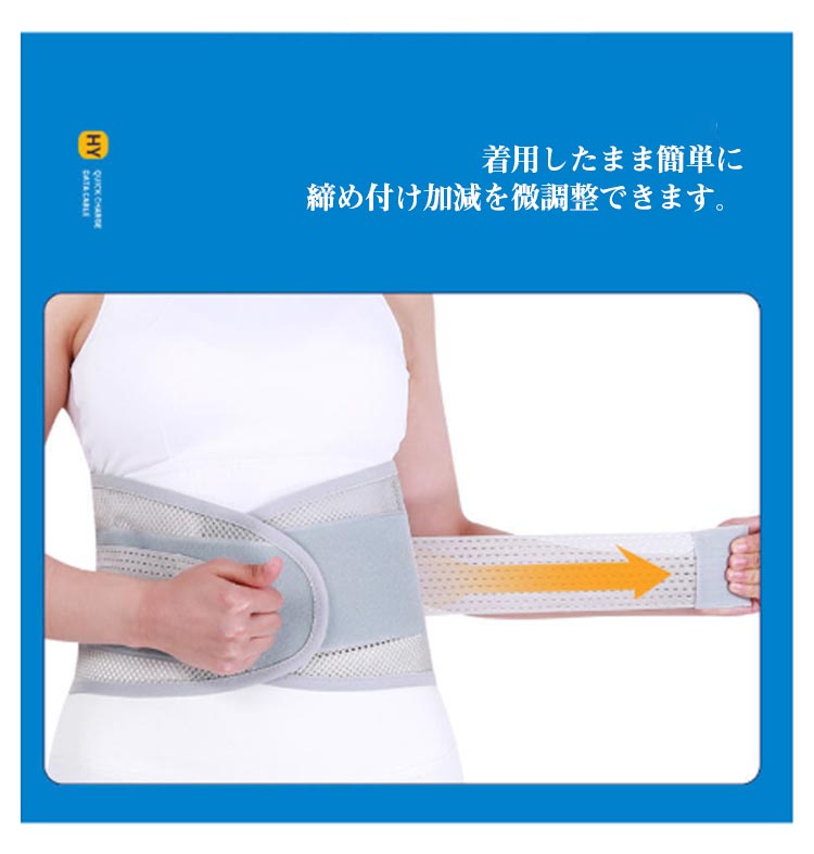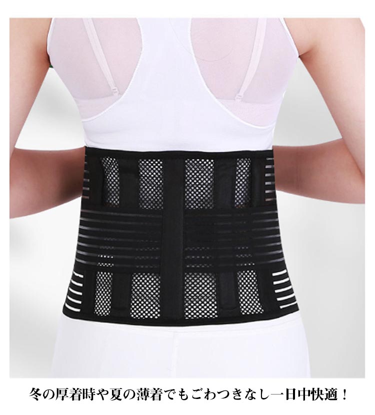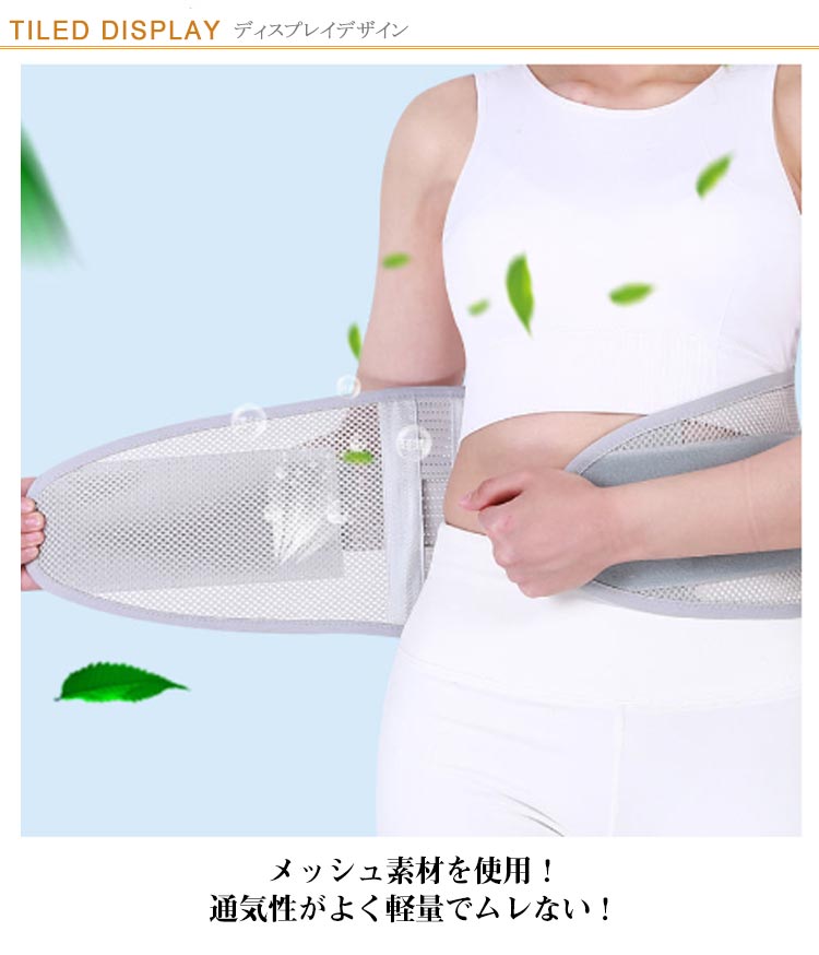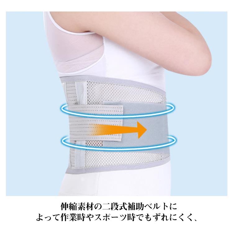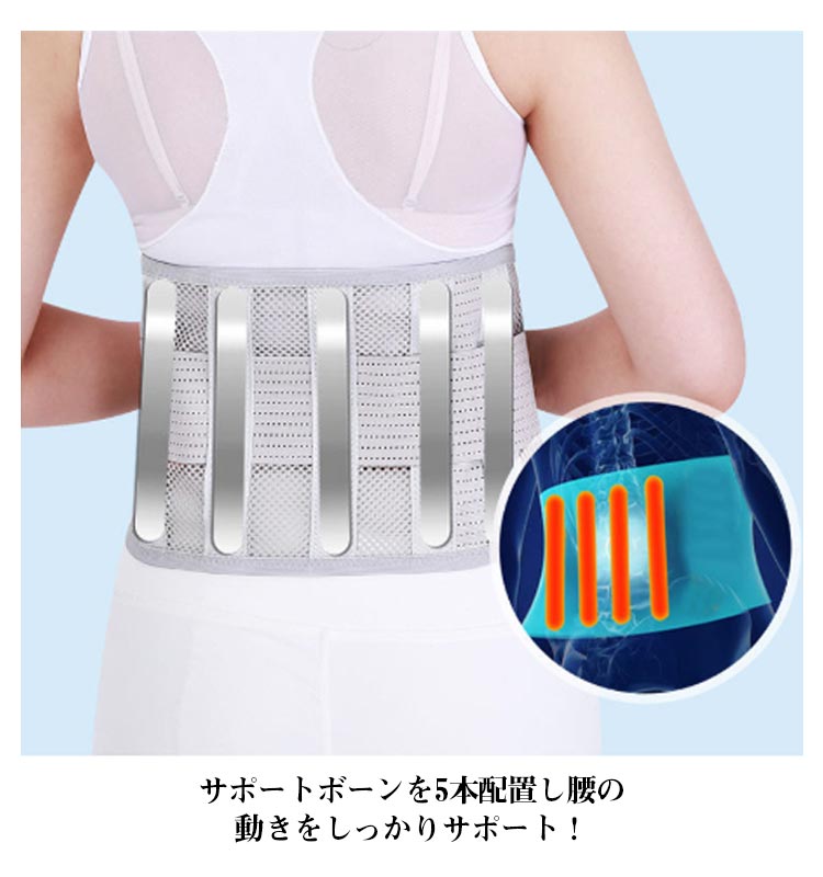 | 男女兼用腰をしっかり支える腰用サポートベルト。 サポートボーンを5本配置し腰の動きをしっかりサポート! メッシュ素材を使用!通気性がよく軽量でムレない! 冬の厚着時や夏の薄着でもごわつきなし一日中快適! 伸縮素材の二段式補助ベルトによって作業時やスポーツ時でもずれにくく、 着用したまま簡単に締め付け加減を微調整できます。 女性や高齢者の方でも簡単に装着可能。 | |