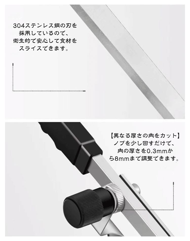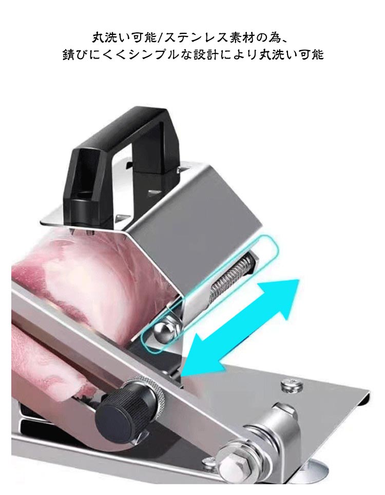 【手動式 ミートスライサー】【替え刃付き】生ハム、冷凍肉などを薄切り可能な手動式のミートスライサー。304ステンレス鋼の刃を採用しているので、衛生的で安心して食材をスライスできます。【異なる厚さの肉をカット】ノブを少し回すだけで、肉の厚さを0.3mmから8mmまで調整できます。吸盤付きスタンド/切断時の横転防止の為、強力な吸盤脚となっております。台がしっかり固定できるから作業も安心丸洗い可能/ステンレス素材の為、錆びにくくシンプルな設計により丸洗い可能冷凍の牛肉、肉、子羊肉、ハム、野菜をすばやくスライスして、鍋、サンドイッチ、ピザ、前菜を作るのに役立ちます。人間工学に基づいたハンドルを備えた冷凍肉カッターは、滑らかな表面と快適な体験を提供します.