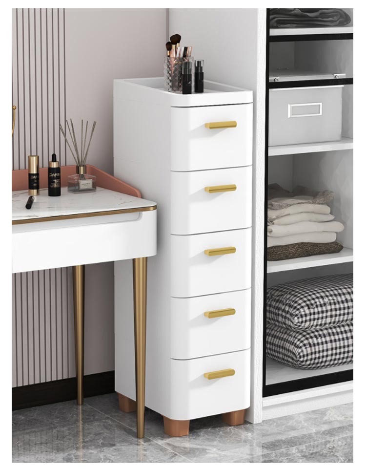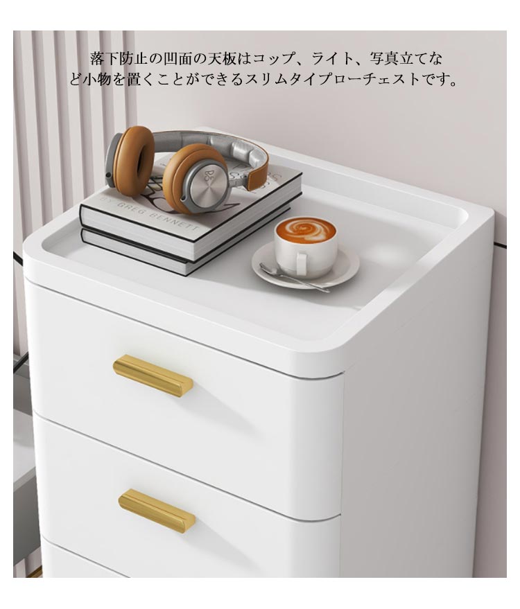 高級感溢れるリビングチェスト♪リビングのデッドスペースを有効活用できるスリムタイプ。インテリアに馴染むおしゃれなデザイン、中が見えないから、どこにでも置けるキッチンストッカー。場所を取らない幅25cmのスリムタイプ、冷蔵庫の横やサニタリーはもちろん、リビングのちょっとした隙間を有効活用できるチェスト。脚があるので掃除がしやすく、湿気もたまりにくい。さらに、コロがついているからお掃除など時移動もラクラクの引き出し収納♪側面と背面も壁付きでホコリが入りにくいスリムストッカー、キッチンやバスルームなど湿気の多い水回りに置いても安心の隠す収納ラック。抜け落ち防止ストッパー付き引き出し、最後まで引き出しても抜け落ちにくくなっています。小さなお子様のいるご家庭でも安心してお使いいただけます。落下防止の凹面の天板はコップ、ライト、写真立てなど小物を置くことができるスリムタイプローチェストです。