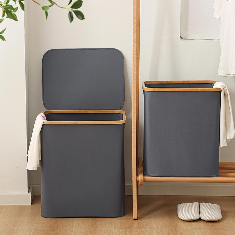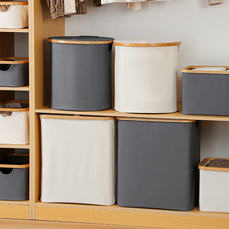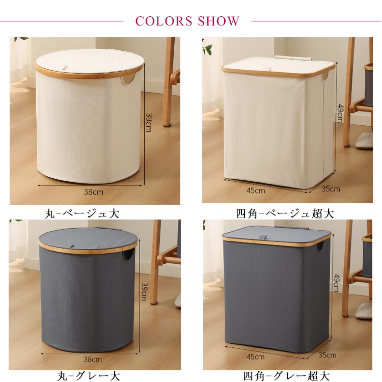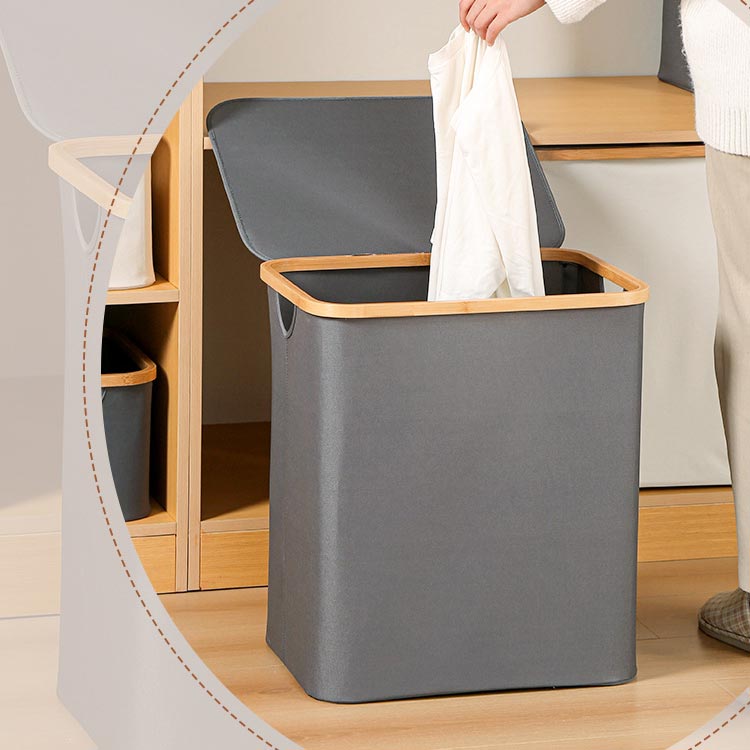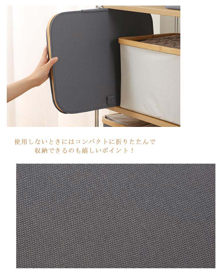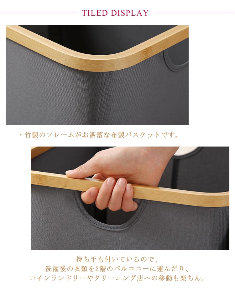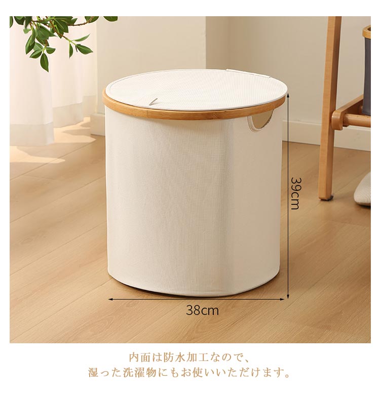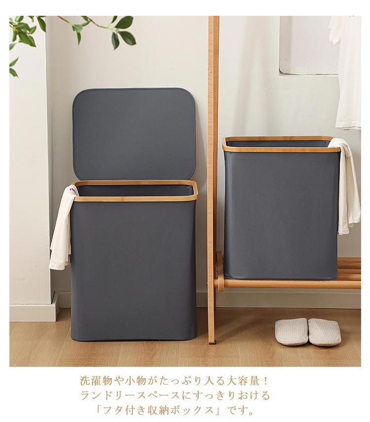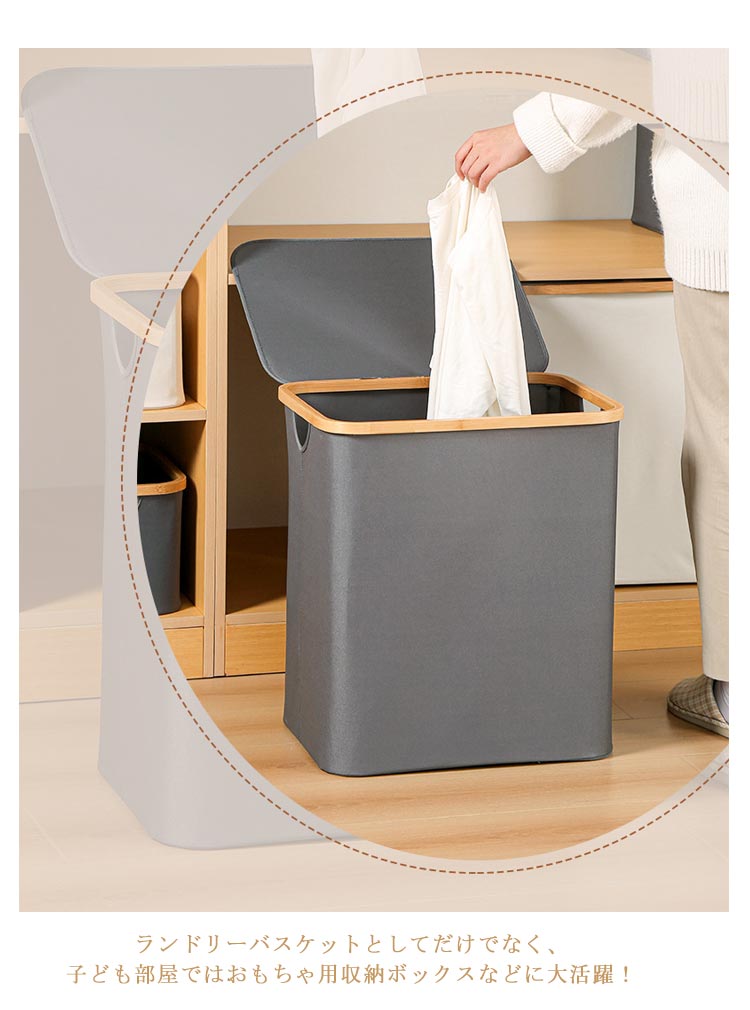 ・生活感を隠してしっかり収納!・竹製のフレームがお洒落な布製バスケットです。・洗濯物や小物がたっぷり入る大容量!ランドリースペースにすっきりおける「フタ付き収納ボックス」です。・内面は防水加工なので、湿った洗濯物にもお使いいただけます。・ランドリーバスケットとしてだけでなく、子ども部屋ではおもちゃ用収納ボックスなどに大活躍!・持ち手も付いているので、洗濯後の衣類を2階のバルコニーに運んだり、コインランドリーやクリーニング店への移動も楽ちん。・使用しないときにはコンパクトに折りたたんで収納できるのも嬉しいポイント!