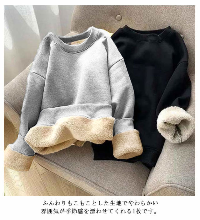 見た目以上に軽量で裏地もあり保温性に優れています。ふんわりもこもことした生地でやわらかい雰囲気が季節感を漂わせてくれる1枚です。女性らしい魅力と可愛さを演出でき、かわいくてあったかい。シンプルな厚手トレーナーはこれからの季節に活躍間違いなしです。カジュアルなデイリーユースから、ビジネス、オフィス、通勤、通学にも~