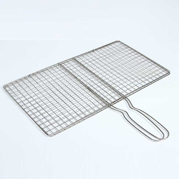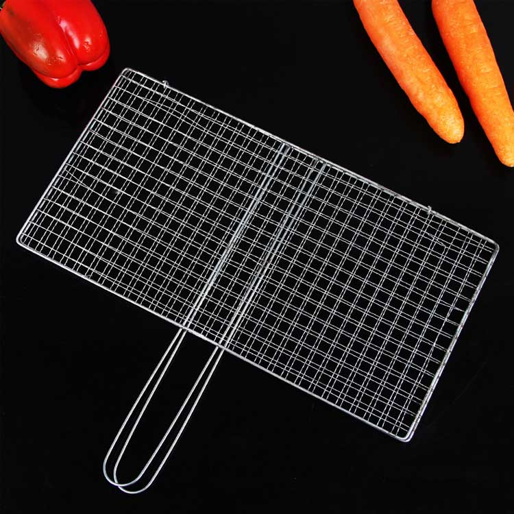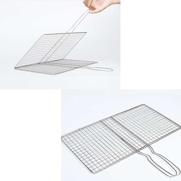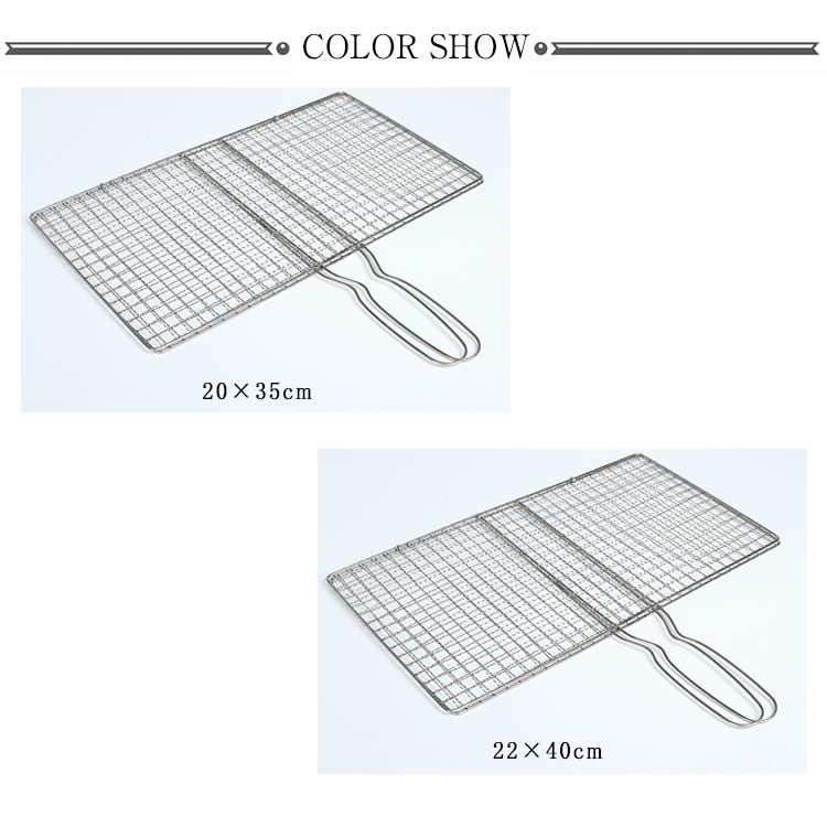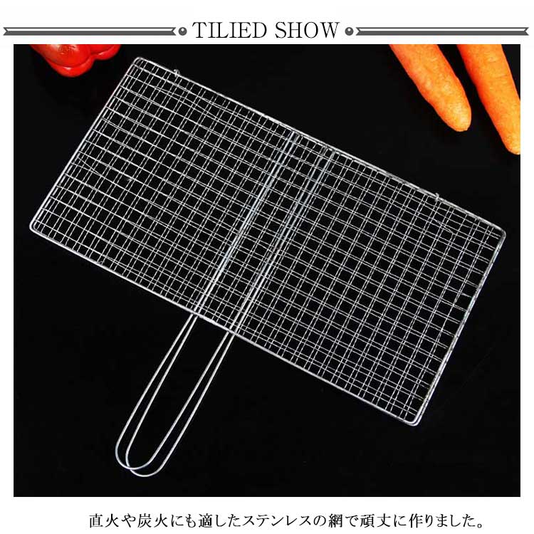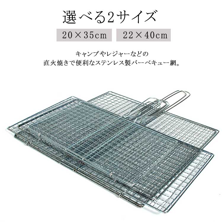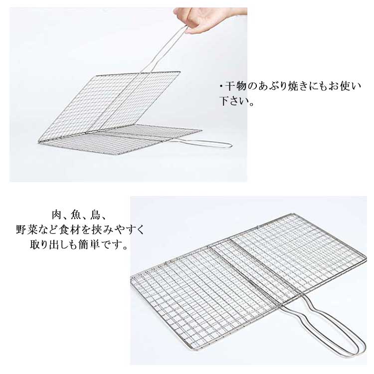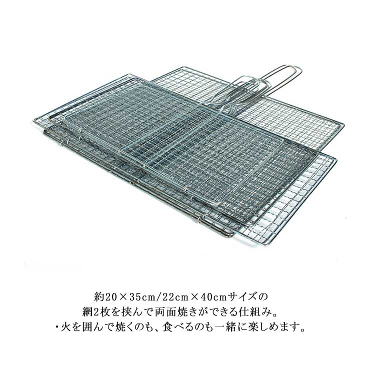 ・キャンプやレジャーなどの直火焼きで便利なステンレス製バーベキュー網。・直火や炭火にも適したステンレスの網で頑丈に作りました。・約20×35cm/22cm×40cmサイズの網2枚を挟んで両面焼きができる仕組み。・肉、魚、鳥、野菜など食材を挟みやすく取り出しも簡単です。・干物のあぶり焼きにもお使い下さい。・火を囲んで焼くのも、食べるのも一緒に楽しめます。※脂や焼き汁の多く出る食材を調理される場合はガスコンロでのご使用は避けて下さい。