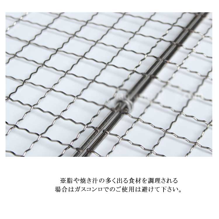 | ?キャンプやレジャーなどの直火焼きで便利なステンレス製バーベキュー網。 ?直火や炭火にも適したステンレスの網で頑丈に作りました。 ?約20×35cm/22cm×40cmサイズの網2枚を挟んで両面焼きができる仕組み。 ?肉、魚、鳥、野菜など食材を挟みやすく取り出しも簡単です。 ?干物のあぶり焼きにもお使い下さい。 ?火を囲んで焼くのも、食べるのも一緒に楽しめます。 ※脂や焼き汁の多く出る食材を調理される場合はガスコンロでのご使用は避けて下さい。 | |