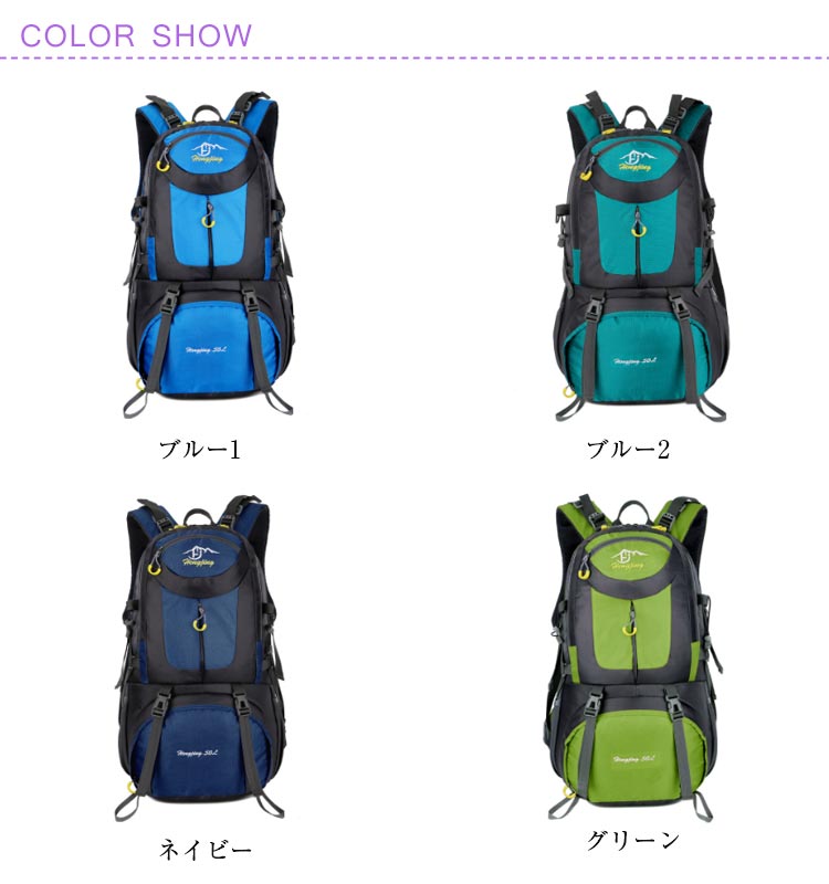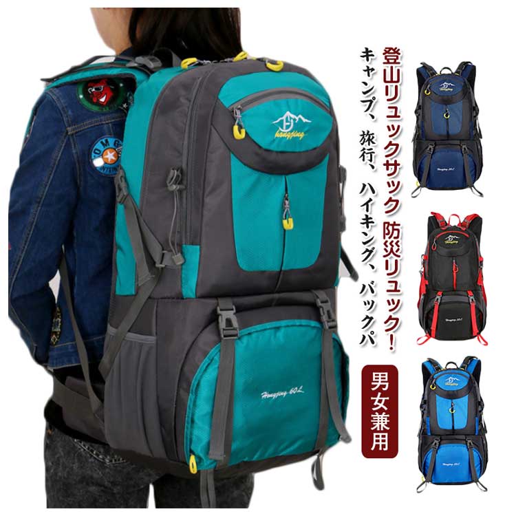 登山リュックサック 防災リュック!キャンプ、旅行、ハイキング、バックパッキングなど、タフなシーンに適したリュックです。撥水のあるナイロン素材を採用するので、雨でも安心使用できます。ポケットも多くストックホルダーやドリンクホルダーもあり機能的にあなたをサポート。タウンからアウトドアまで幅広くお使い頂けます。背中と肩のベルト部分には厚手のクッション材が使われているので、重くても疲れにくいですし、背中に接する部分はメッシュ構造で通気性が良くて、有効的に背中の乾燥を保持し、快適感を感じます。