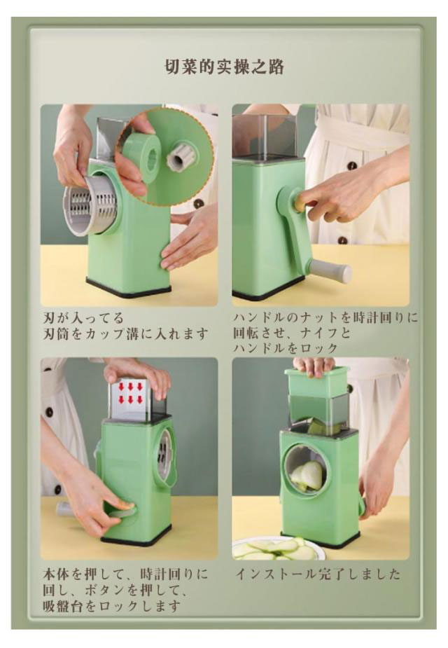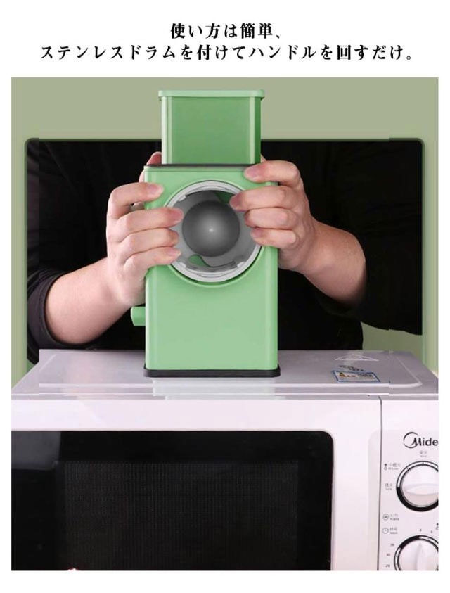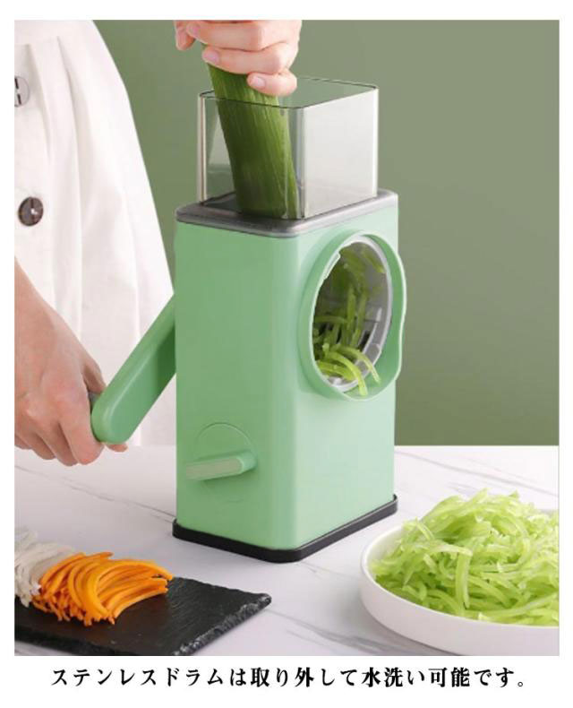 | ハンドルをくるくる回すだけで、スライスや細切り、すりおろしが楽々できるマルチスライサー。 使い方は簡単、ステンレスドラムを付けてハンドルを回すだけ。 千切り刃、スライス刃、すりおろしが含まれています。 このスライサーはきゅうり、キャロット、玉ねぎ、ナッツ、ジャガイモ、チーズ、サラダなどお好きな料理に最適です。 これ一台でいつものお料理の下ごしらえが、ぐっと楽になります。 ステンレスドラムは取り外して水洗い可能です。 | |